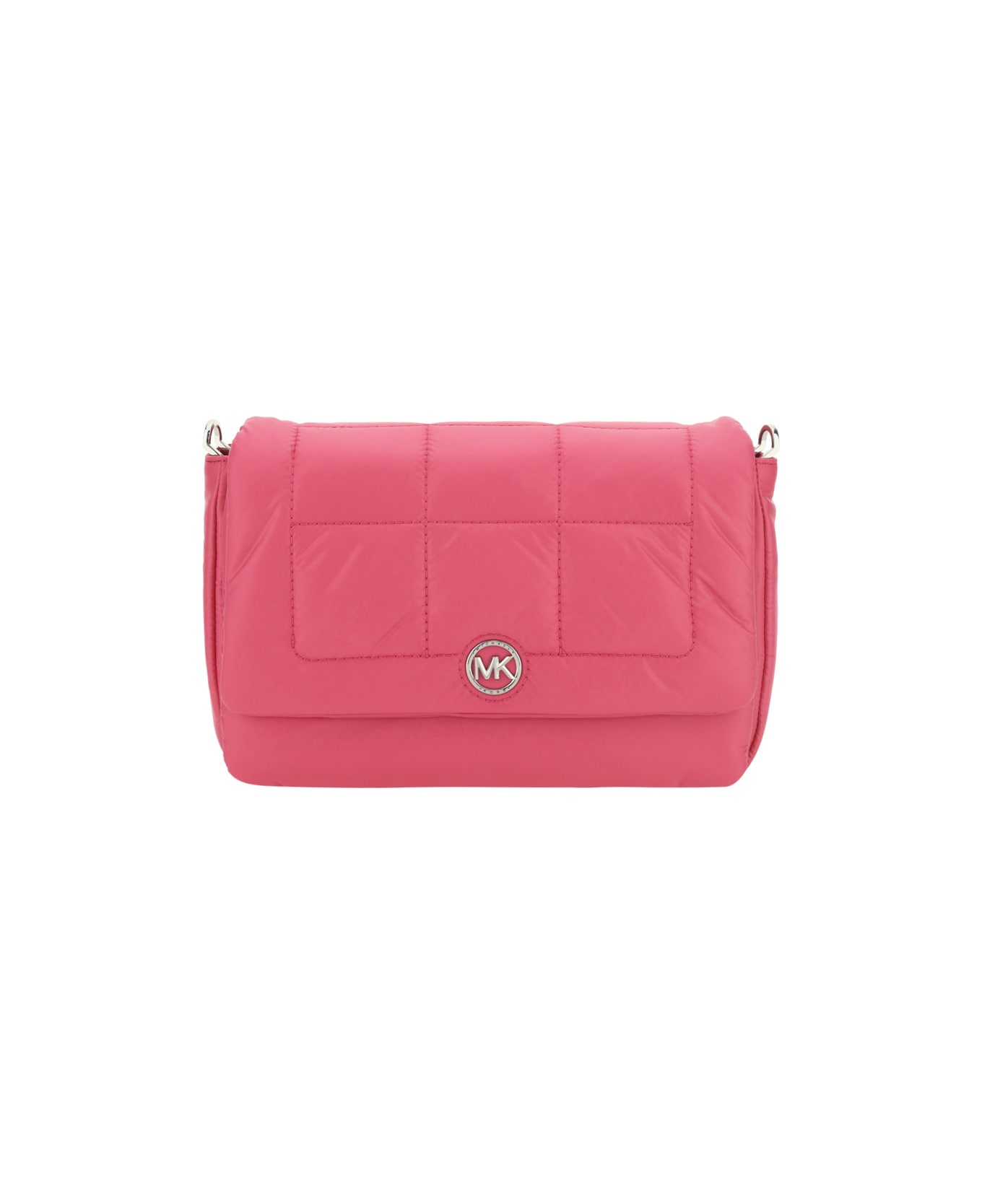 Lilah flap shoulder bag by michael kors, removable and adjustable flat shoulder strap, plaque with iconic brand monogram embossed applique on front, magnetic front flap closure, padded and quilted flap, double interior compartment, interior slit pocket.