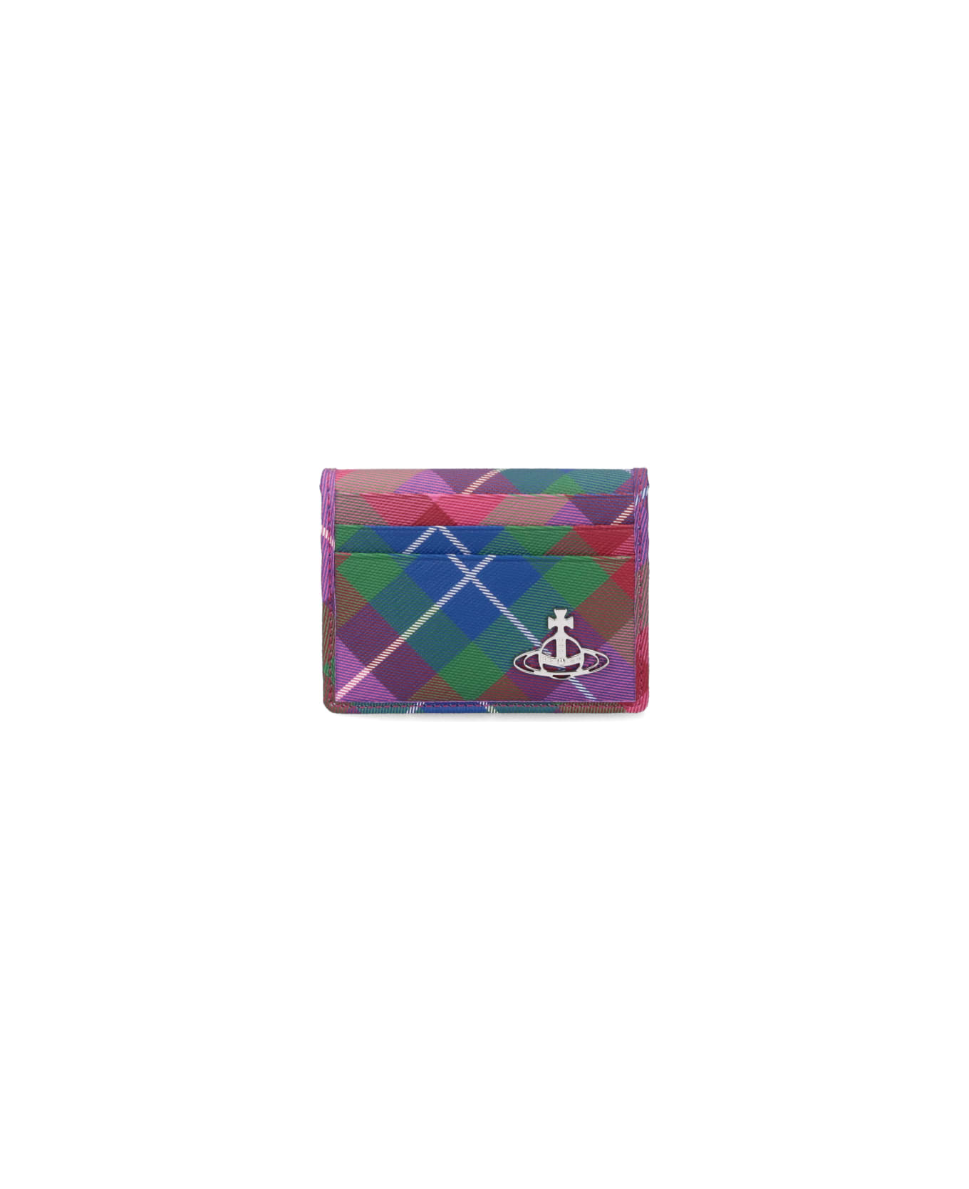 Vivienne Westwood 'Man' bifold card holder in multicolor fabric with all-over Candy Tartan geometric pattern, silver metal Orb logo on the front, six card slots on the front and back, six inner card slots. Composition: 100% Textile