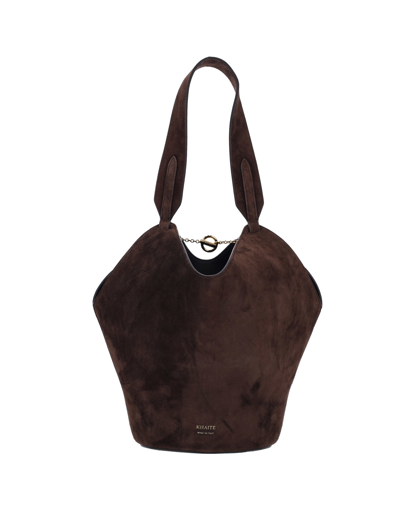 Khaite 'Lotus' small tote bag in dark brown calf suededi with top handle, gold metal chain closure and hook, gold logo embossed on the front, single main inner compartment. Composition: 100% Calf Leather