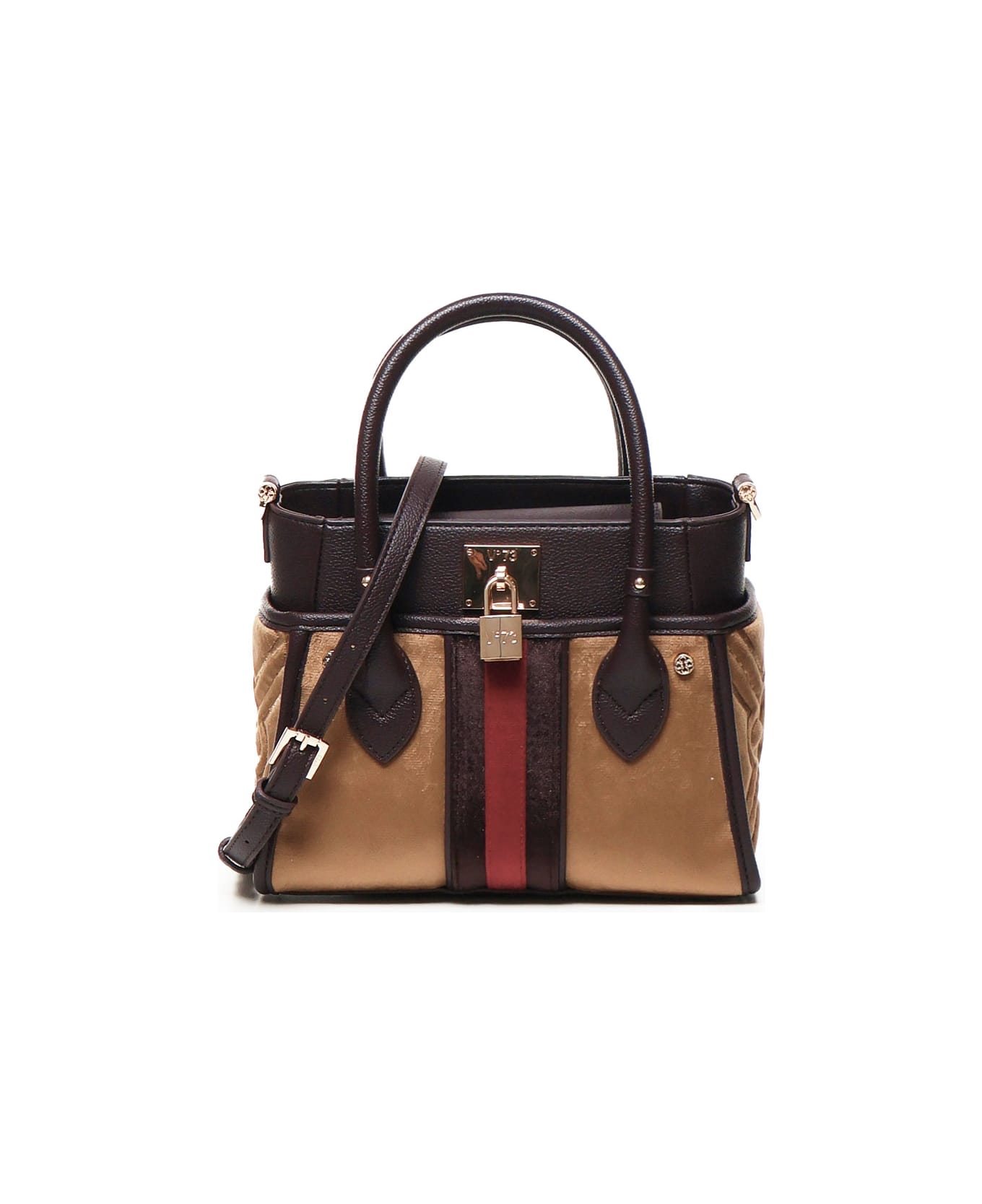 -Line made of velvet -Grain carryovers -Embroidered on the sides -Two-tone central band -Personalized padlock -Removable bag for double portability -Colour: Beige, red