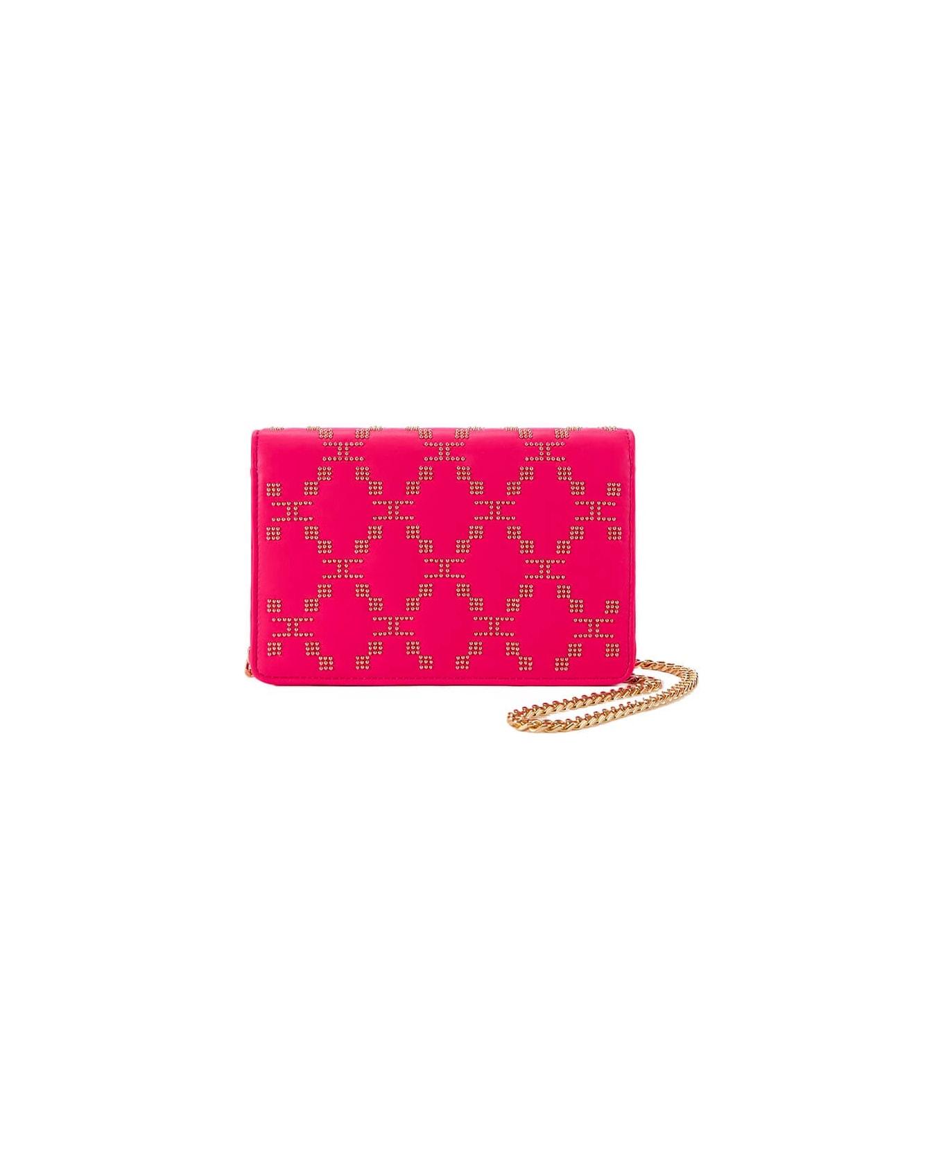 Elisabetta Franchi crossbody bag made of fuchsia synthetic leather with golden micro studs on the front. Interior with slip compartments and magnetic closure. Chain shoulder strap, measures 19x12x4 cm. Composition: 55% polyester, 45% polyurethane.
