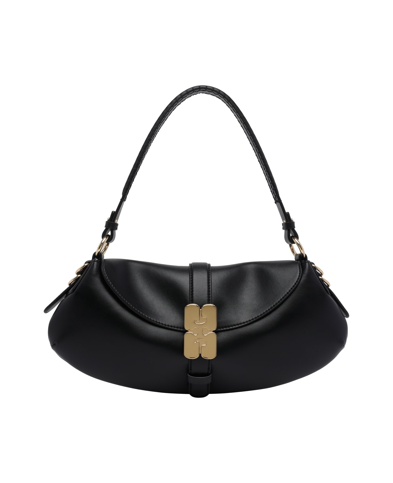 Ganni black Kat baguette shoulder bag, magnetic closure, inner open pocket, removable handle, logo Composition: 51% Leather (recycled), 30% Polyester, 19% Polyurethane