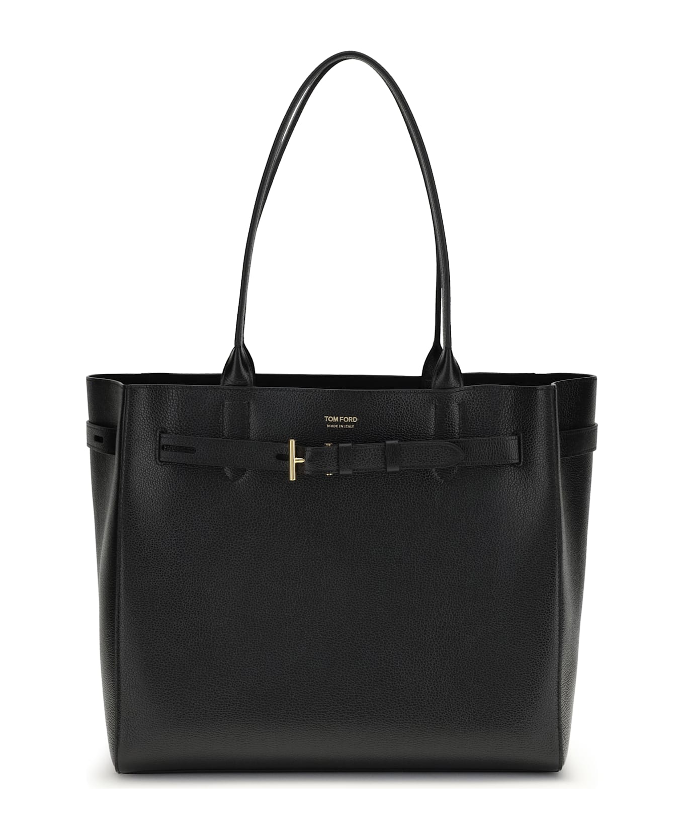 The large audrey leather tote bag by tom ford is an icon of elegance and functionality. crafted from textured leather, it features two flat top handles for comfortable carrying and a belt closure at the top, adding a touch of sophistication to the design. the brand's iconic monogram printed in contrast on the front panel enhances its authenticity, while the single compartment interior offers ample space for your belongings.
