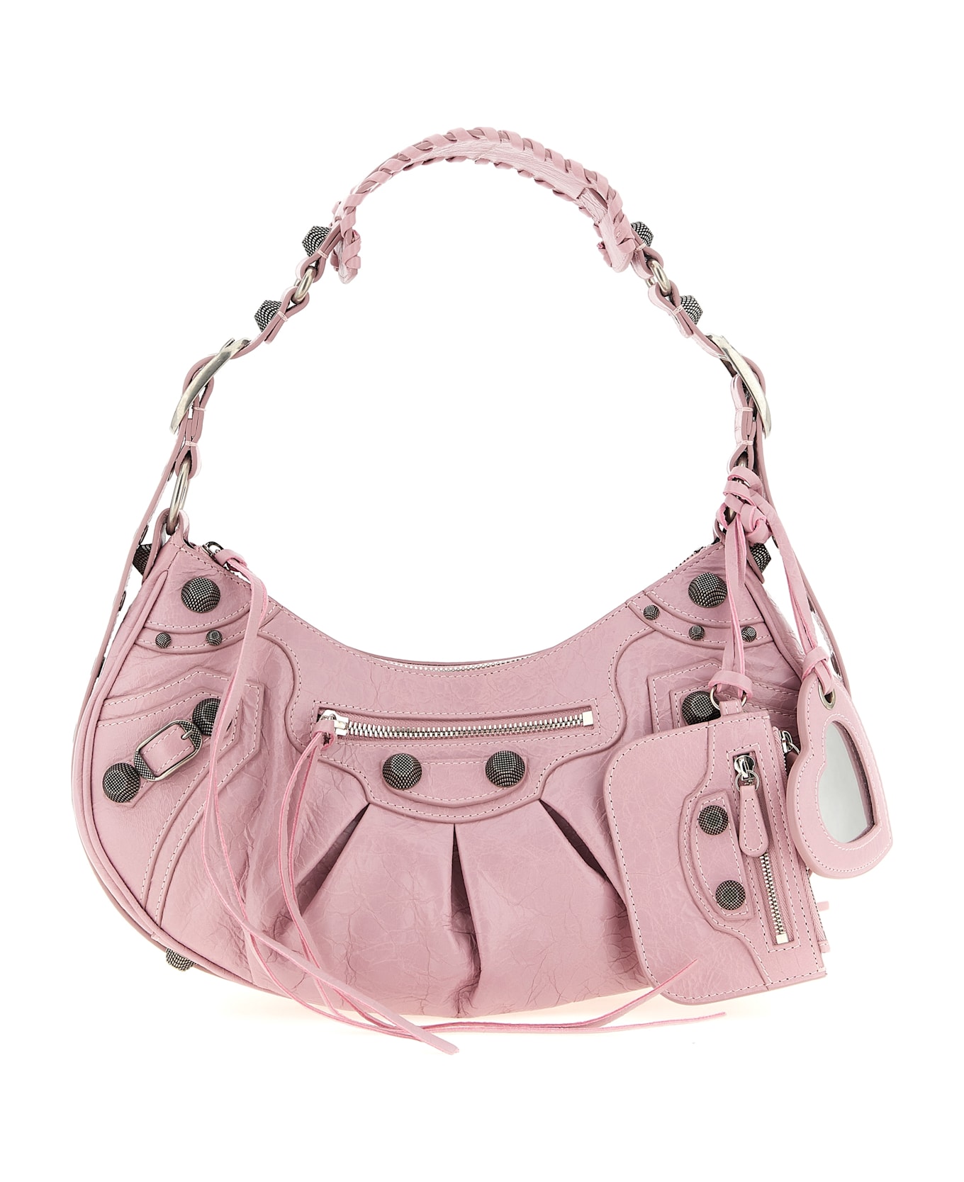 Arena 'Le Cagole S' lambskin shoulder bag with antiqued silver stud details, adjustable handle with braided leather shoulder pad, top zip closure, front and back zip pocket, cotton canvas lining, removable coin purse, removable heart mirror.