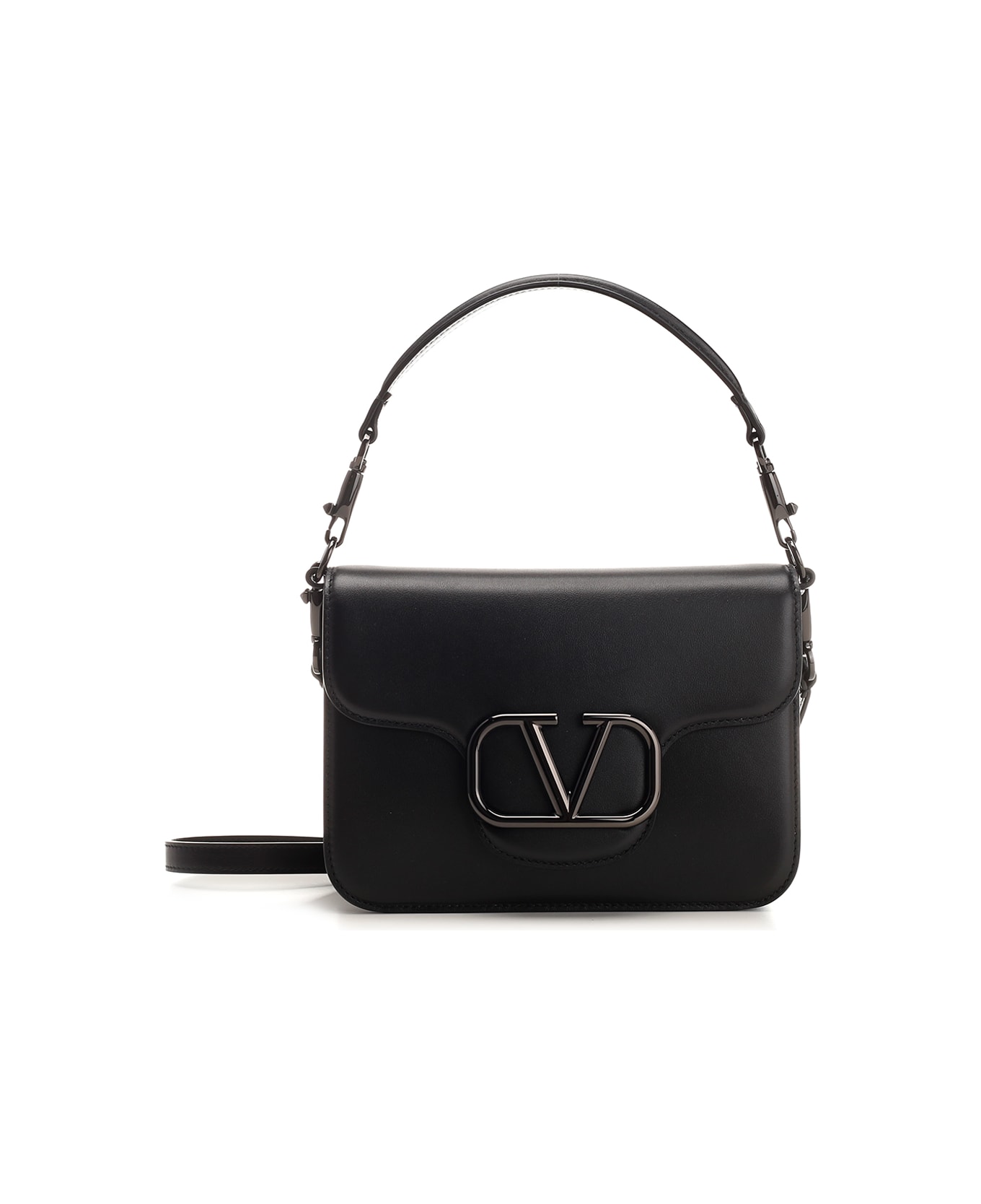 'Loc houlder bag from Valentino Garavani in matt black leather with ruthenium-finish hardware, two detachable shoulder straps, interior with card slot, magnetic snap button under the flap. Composition: VT100% EXTERNAL MATERIAL I VT I CALF LEATHER - BOS TAURUS