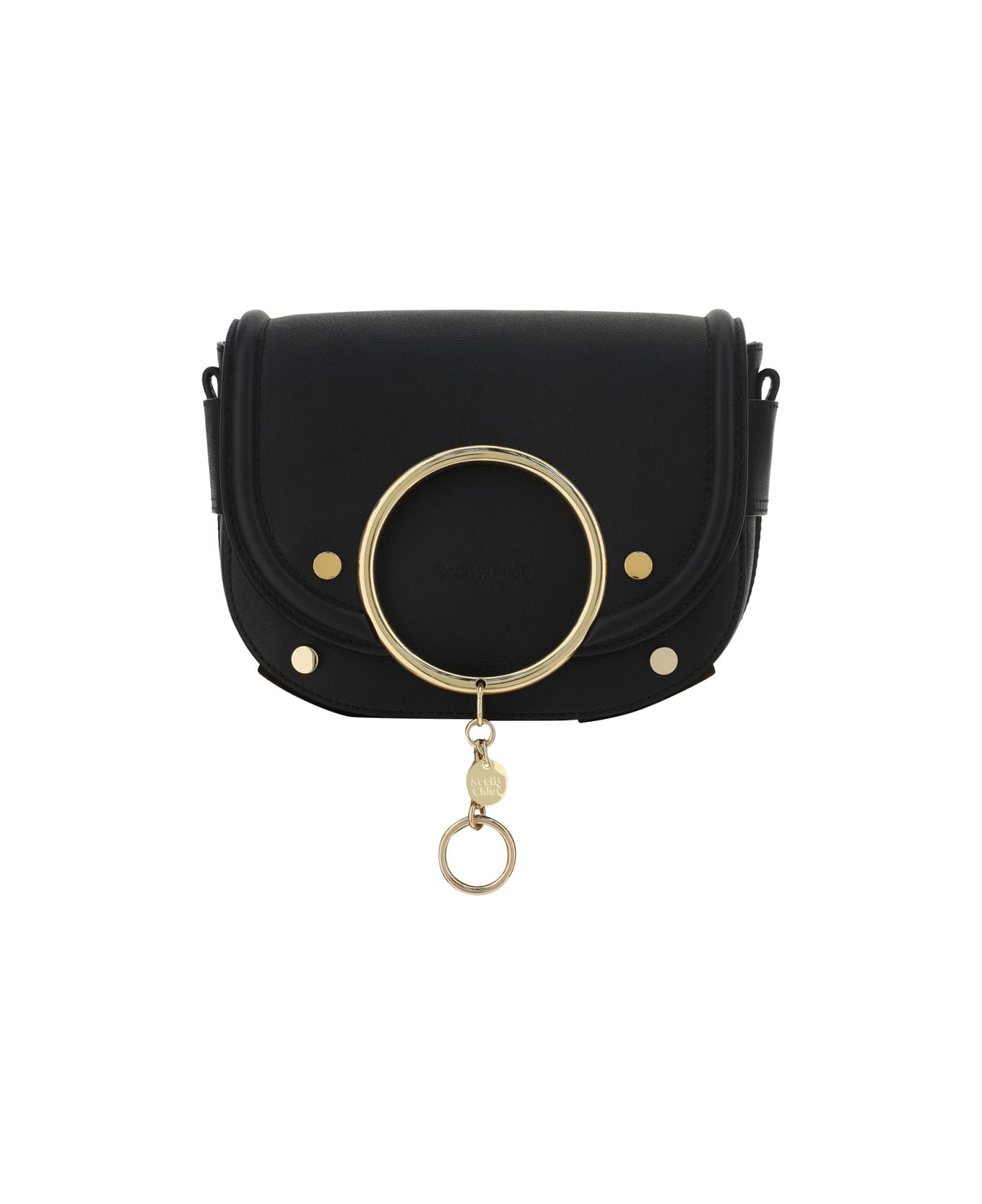 Calfskin mara bag by see by chloé, removable and adjustable leather shoulder strap, gold-plated maxi jewel appliqué on the front, magnetic front closure, single internal compartment, internal welt pockets.
