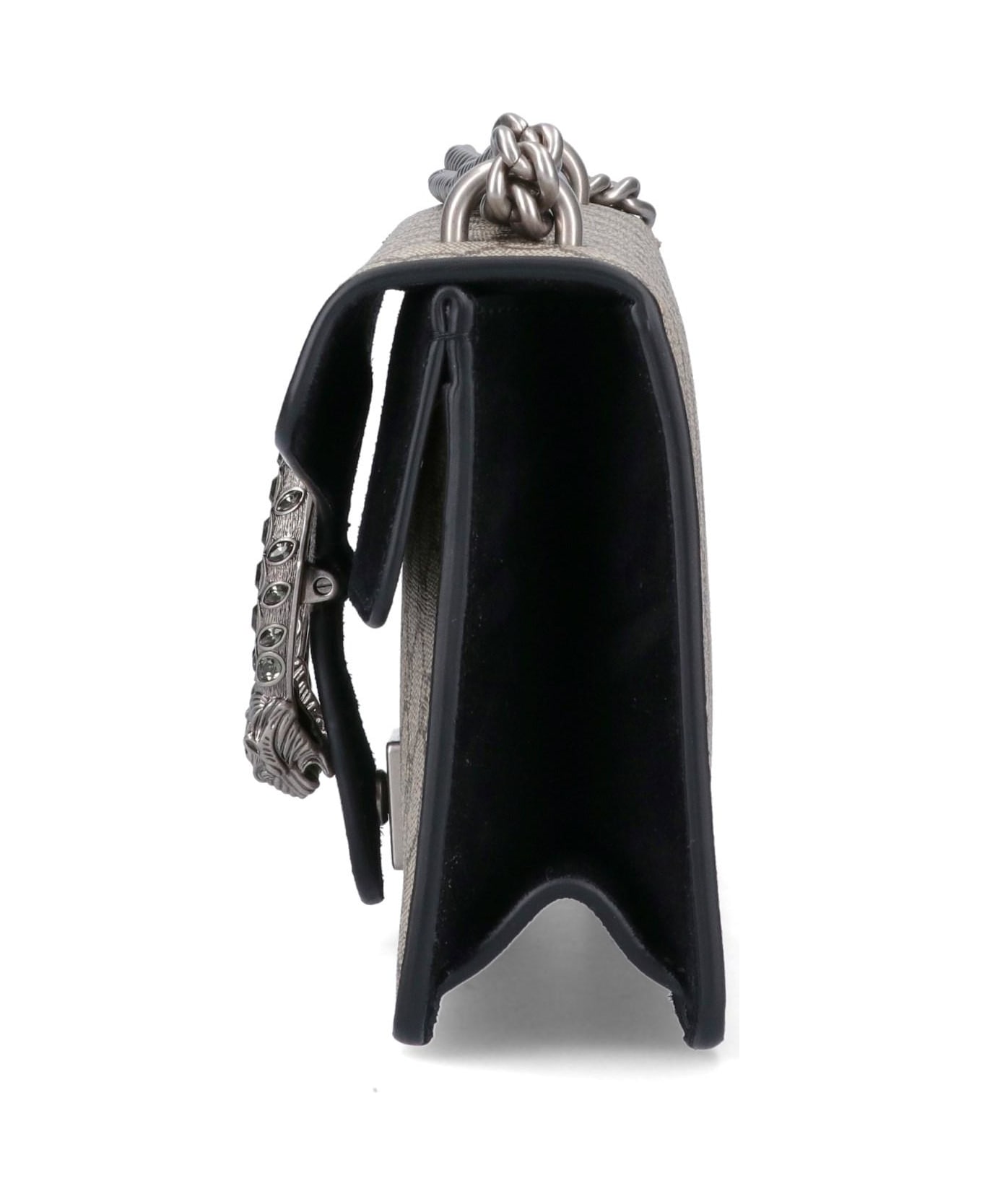 Gucci Small Shoulder Bag 'Dionysus', made of beige 'gg supreme' fabric, black leather details, all-over 'gg' pattern, crystal tiger head closure, adjustable chain shoulder strap, one interior zipper pocket, two main interior compartments.
