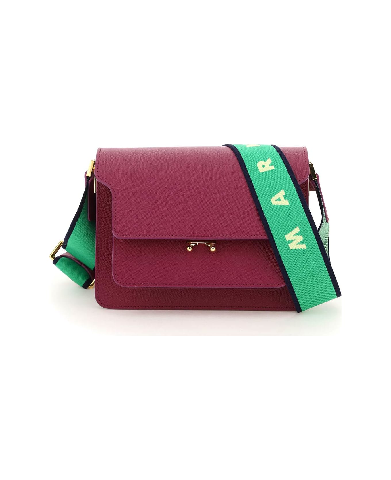 Marni Trunk medium bag crafted in smooth leather and characterized by the adjustable fabric shoulder strap with jacquard logo. Flap with snap closure, side metal inserts with engraved logo, back slit pocket, four gusseted compartments, two inside zip pockets and cotton fabric lining. Gold-tone metal hardware.