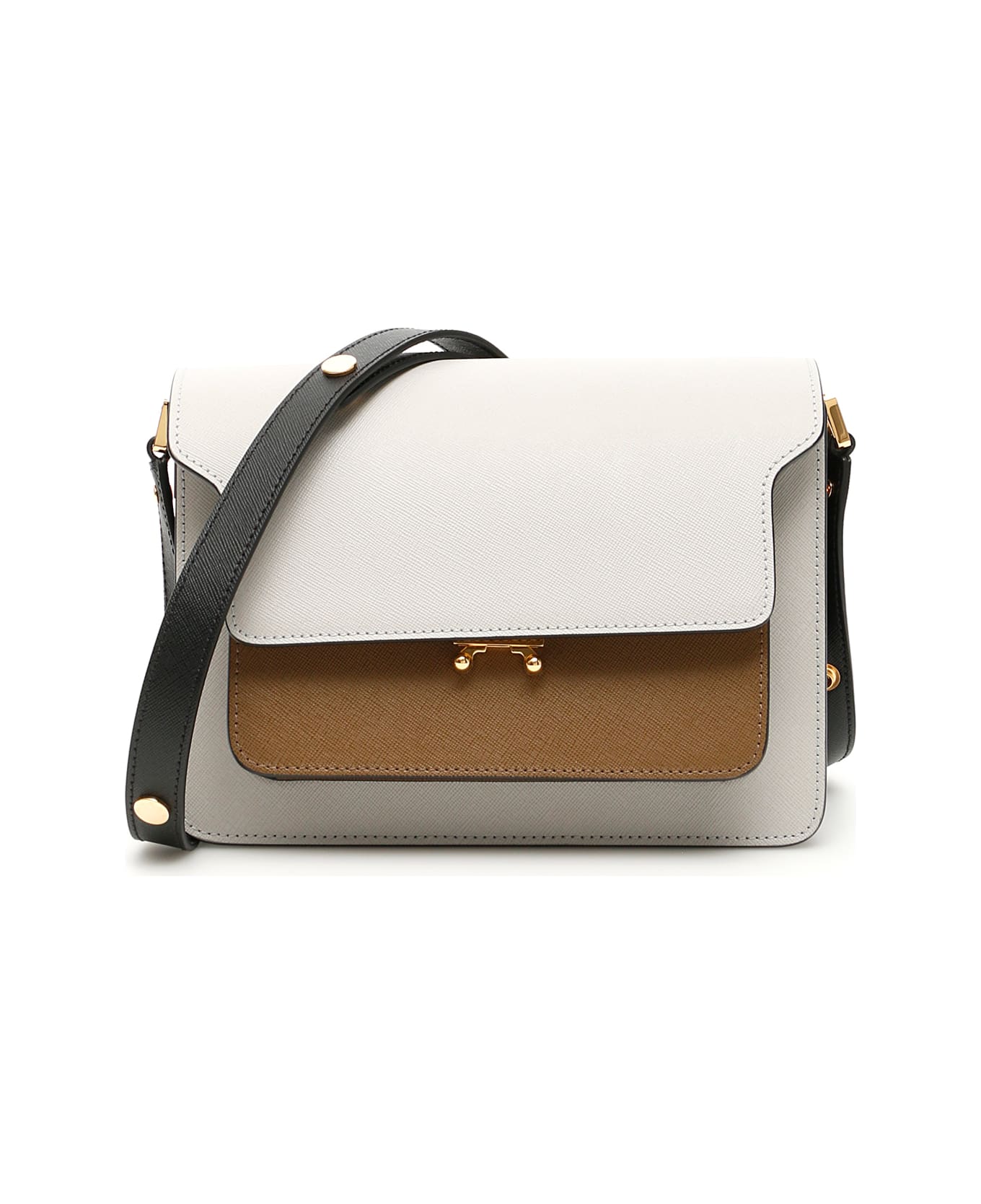 Marni multicolor leather Trunk medium bag with contrasting hems, adjustable shoulder strap with extra insert to make it longer and flap with snap closure. Back slit pocket, four gusset compartments, two inside zip pockets and fabric lining. Gold-tone metal hardware.