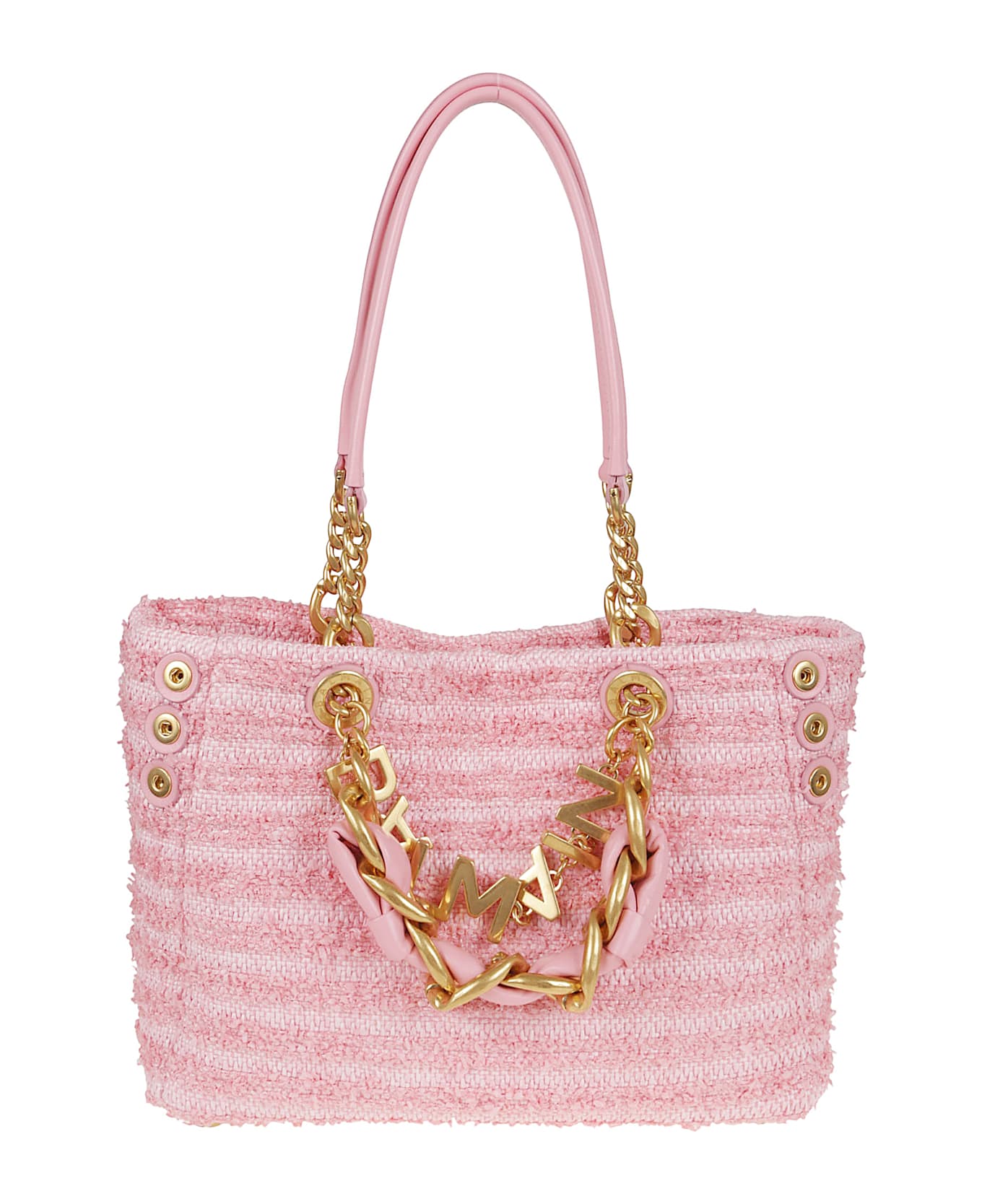 1945 small Soft shopper bag in tweed-effect raffia by BALMAIN. Magnetic closure; adjustable side gussets with three press studs; double handles in leather and chains intertwined with leather; metal feet; internal zip pocket and card holder in embossed leather. Features a semi-removable metal Balmain Logo.