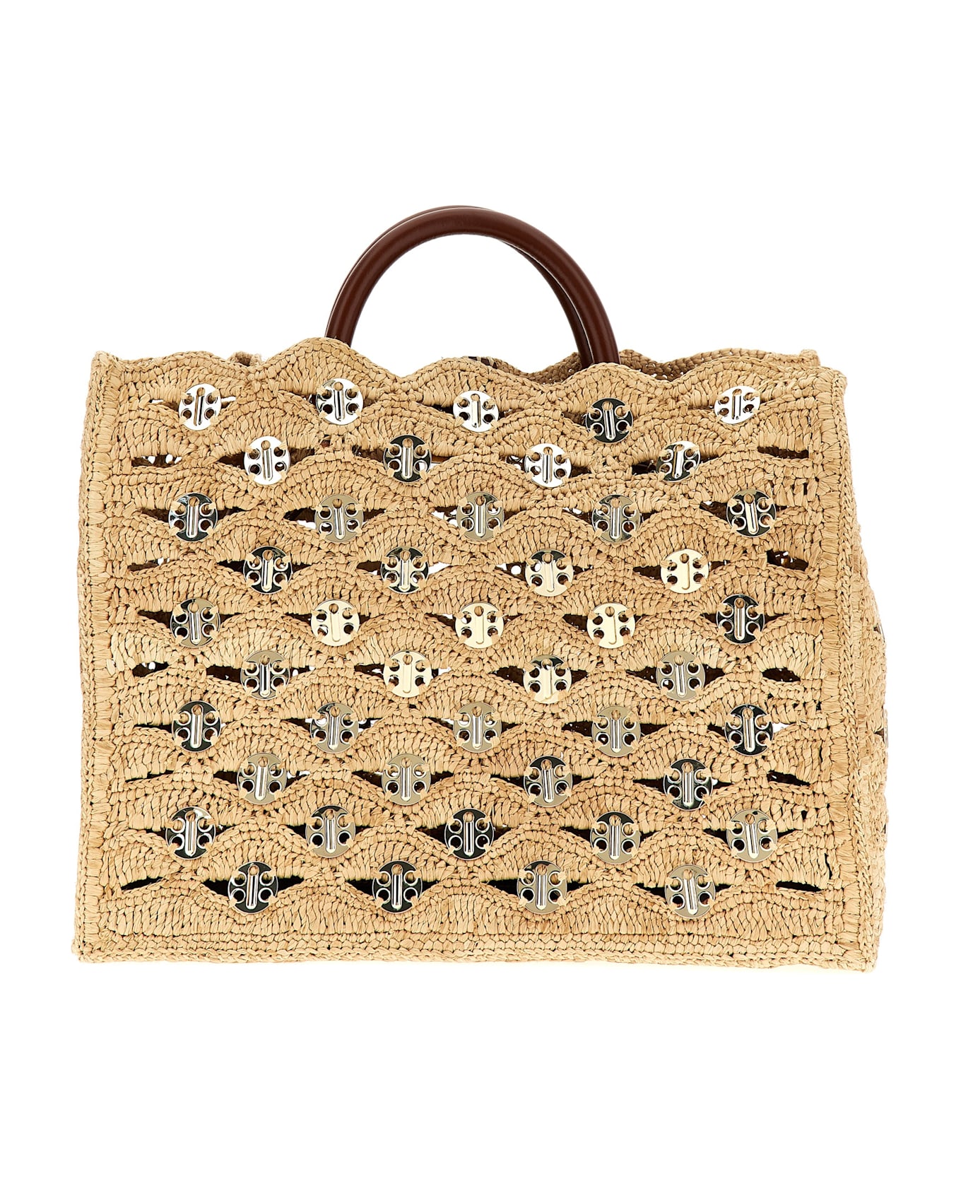 '1969' raffia handbag with metal pad appliqué, double fixed leather hand handle, double removable leather shoulder handle, magnetic closure.