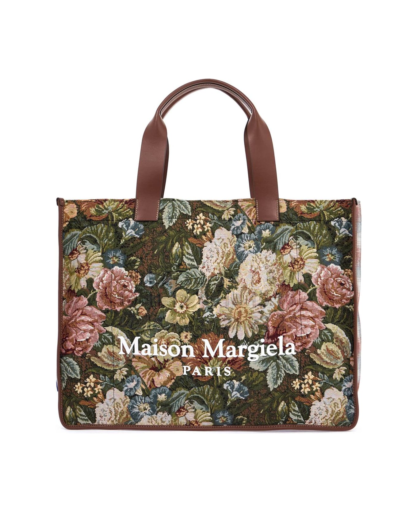 The Maison Margiela shopping bag is made of a floral tapestry fabric, reminiscent of ancient tapestries, with sides and base in Pendleton check wool and leather trims and handles. It features a magnetic closure, a lined interior with three large open pockets, and is adorned with a rubber logo label and lettering.