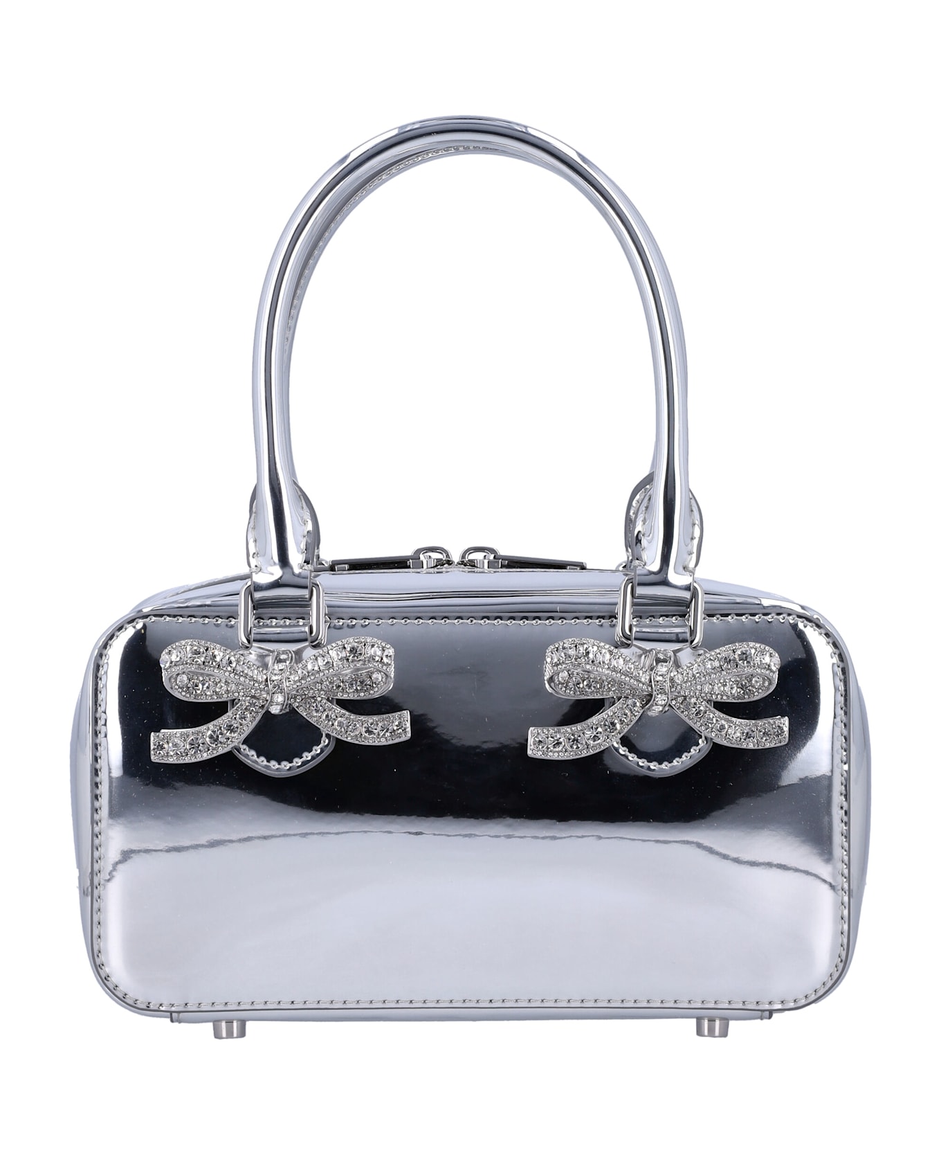 Metallic Leather Mini Tote Bag By Self-portrait. Featuring: Zip Closure Round Top Handles Diamanté Bows Embellishment At Front Metal Feet Silver-tone Metal Finish Height: 23 Cm Width: 26 Cm Depth: 11 Cm