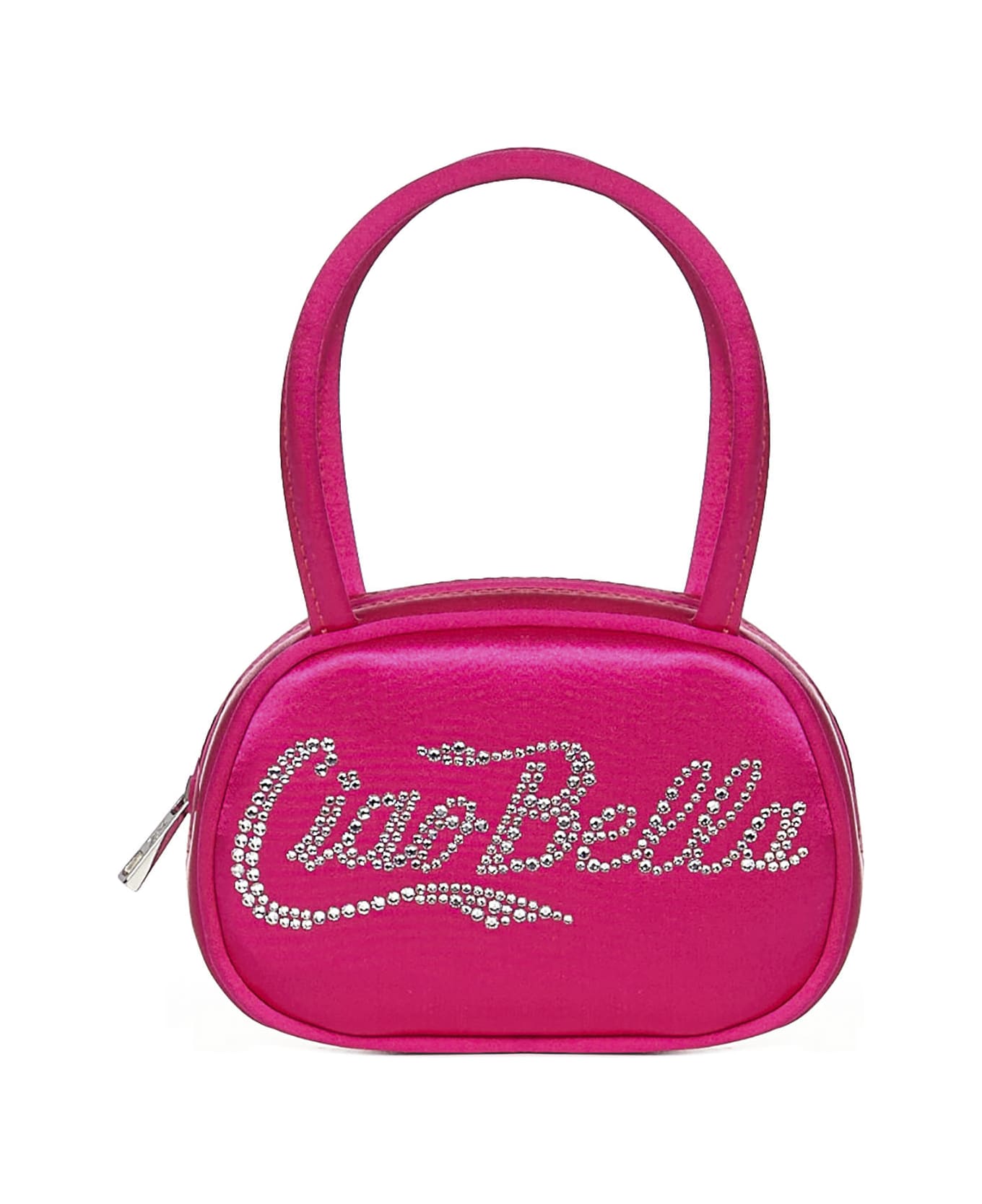 New IT-bag from Amina Muaddi's precious hands, the Mini Bella in ruby-colored satin is the most glamorous and shimmering accessory of the season. Double handle and zip closure trace the lines of the mignon design, illuminated by the crystals on the front that form the text Ciao Bella.