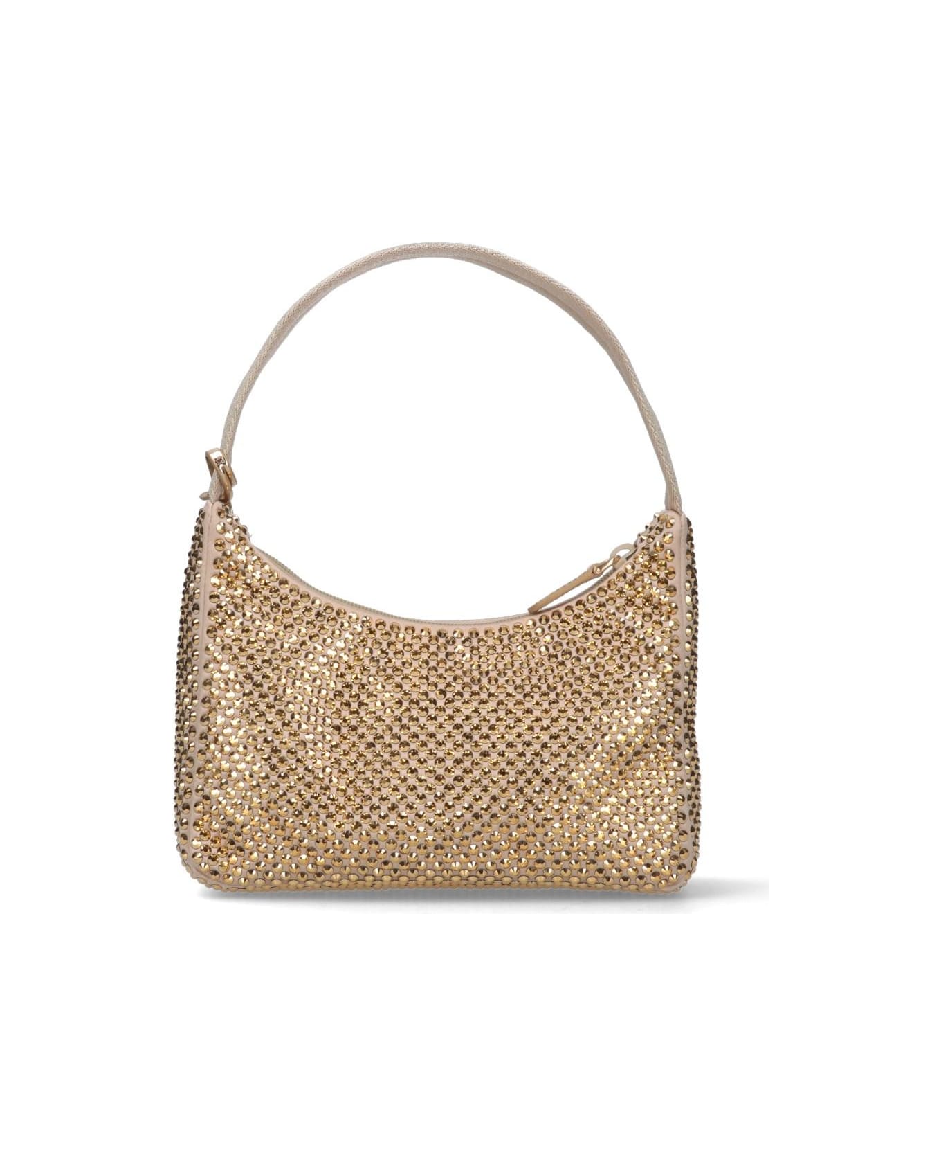 Prada Mini Crystals Bag, made of gold satin, al-over applied crystals detail, top handle, zip fastening, removable logo key holder detail, tone-on-tone metal logo on front, one internal compartment.