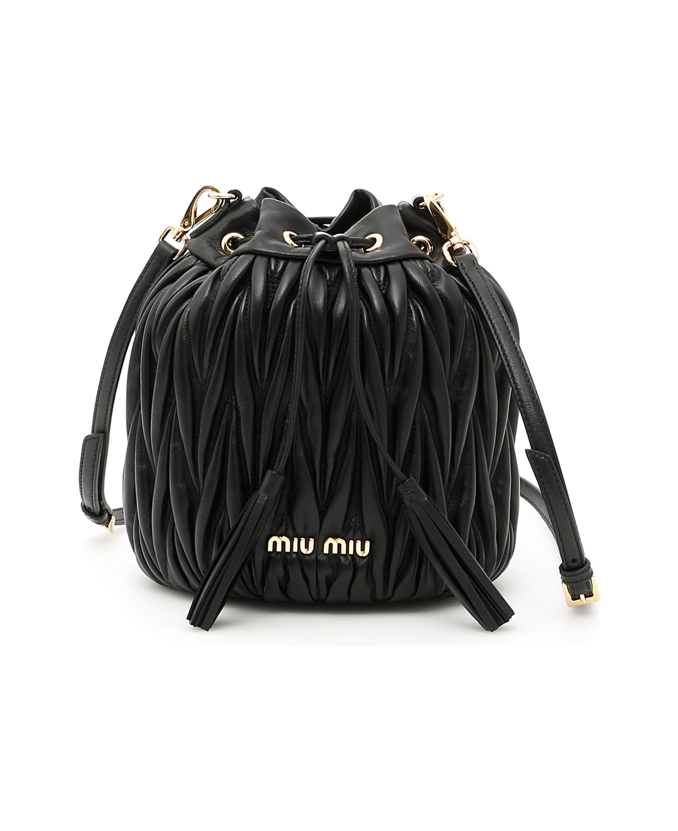 Miu Miu quilted nappa bucket bag with removable and adjustable strap. Leather drawstring with tassels, logo and leather base with embossed "m". Satin lining, inside pocket, gold-tone metal hardware. Composition: 100% agnello