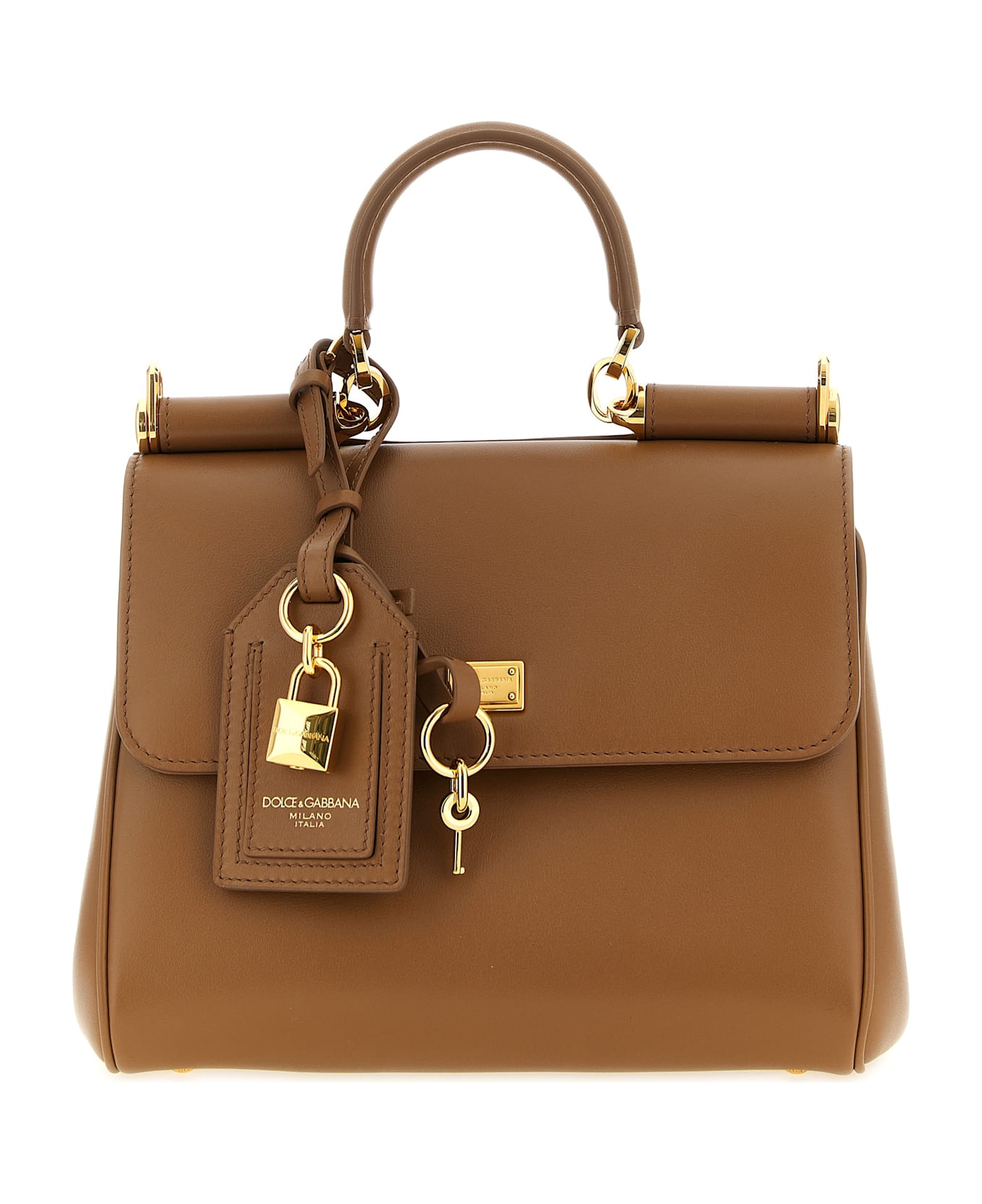 Small 'My Sicily' handbag in plongé calf leather, vintage brass galvanic metal details, flap closure with tuck-in mechanism and monogalvanic metal tag with front engraved logo, fixed handle, rigid bottom with metal feet, back zip pocket and embossed logo, including adjustable and removable glue, name tag with key and removable metal padlock.