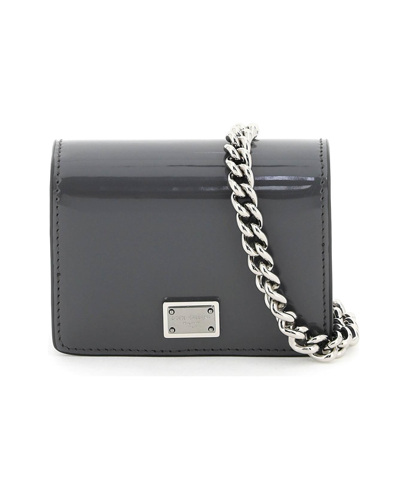 Dolce & Gabbana mini crossbpdy bag crafted in patent leather with iconic applique plate on flap. Magnetic closure, smooth leather interior with one credit card slot and detachable chain shoulder strap. Silver-finished metalware. Composition: 100% calf leather