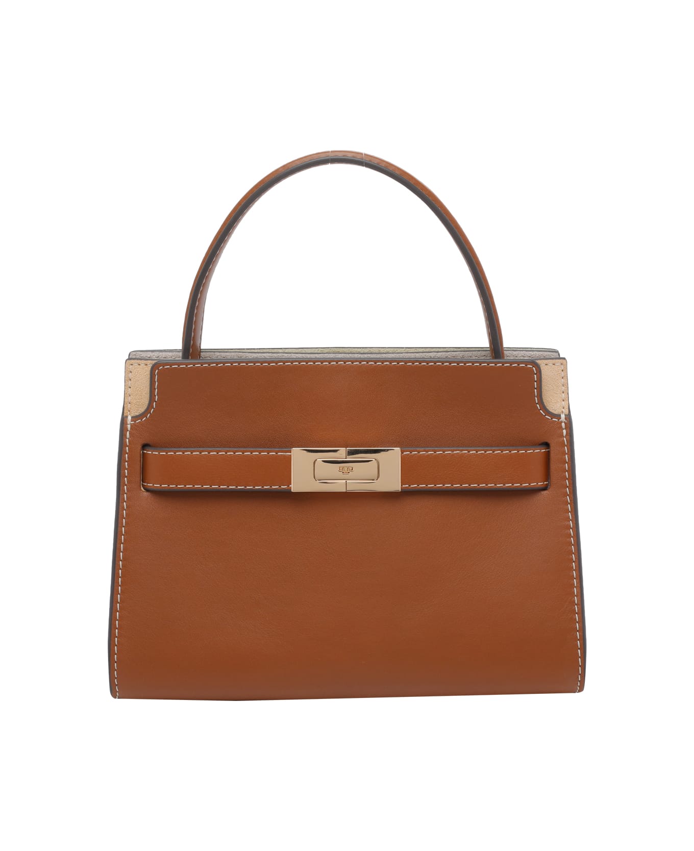 Tory Burch brown petite Double Lee Radziwill handbag, clip closure, inner slot, 2 open pockets, adaptable and removable strap