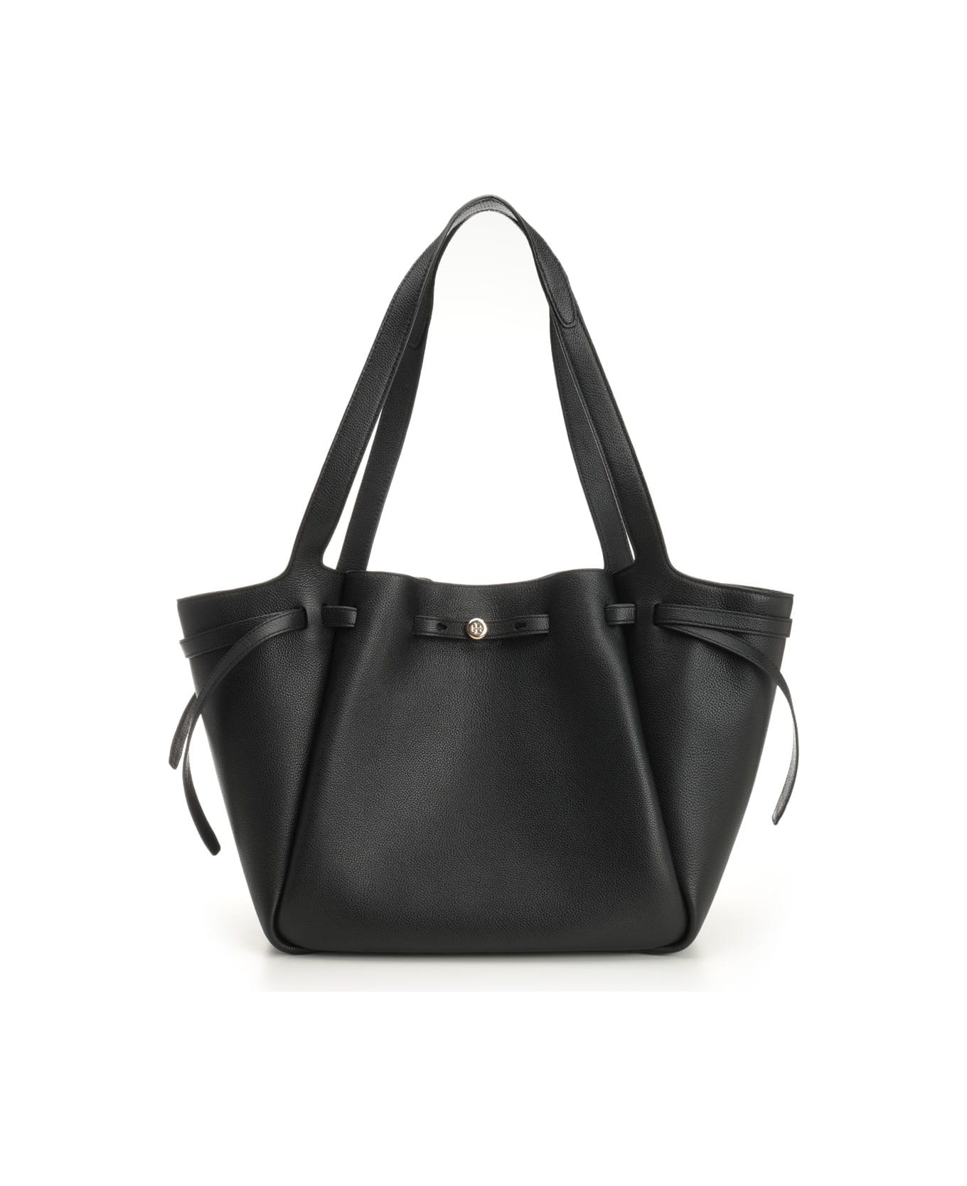 'Romy' shopping bag in hammered leather by Tory Burch, with a thin belt to define the curves, shoulder strap and zip pocket