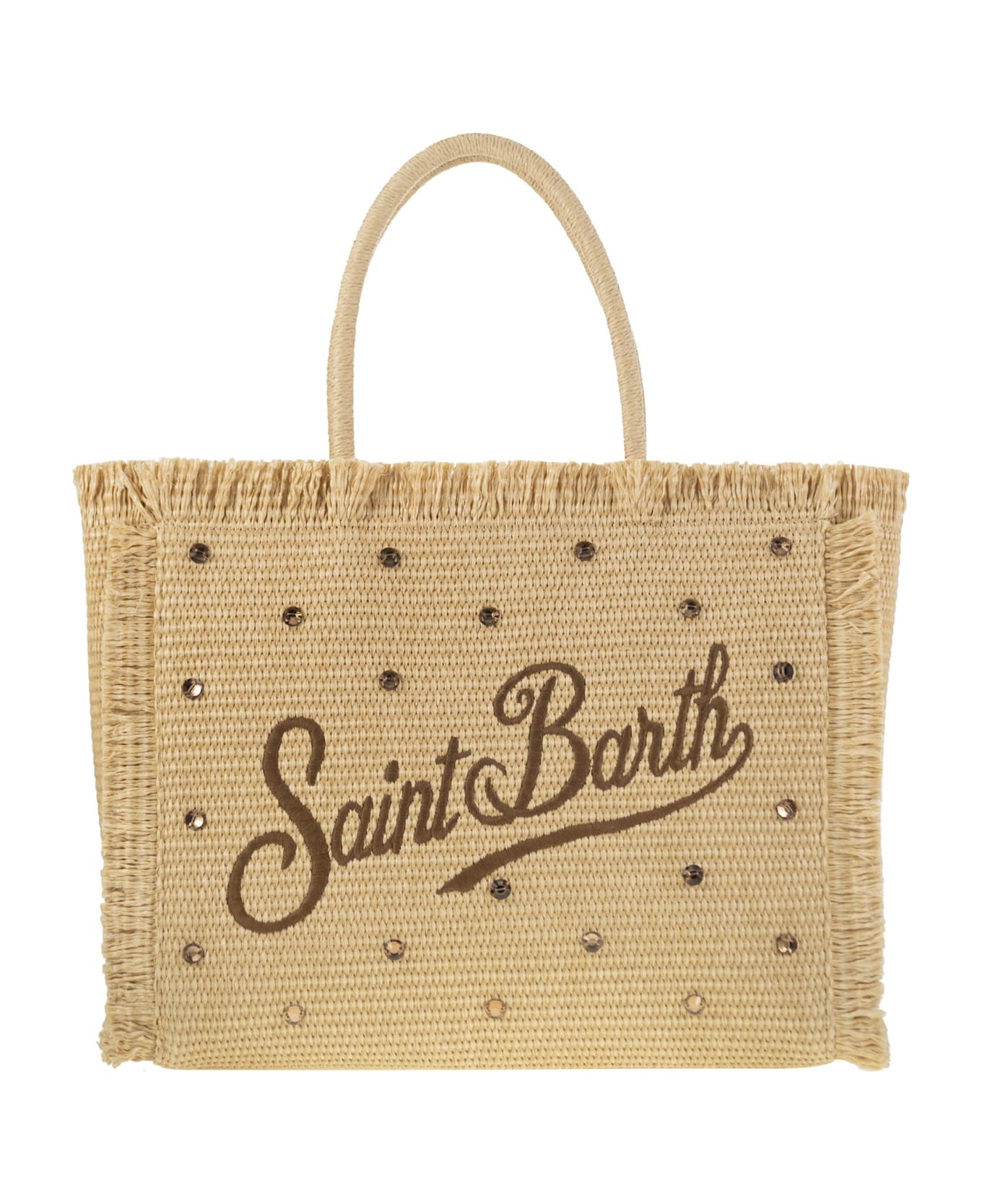 The Vanity Straw Bag, a sophisticated accessory made of durable synthetic straw. Its medium design combines durability and elegance, with stitched rhinestones adding a bright touch. Perfect for any occasion, this tote bag offers a refined look with lasting quality, combining style and functionality effortlessly. - Vanity straw-effect shoulder bag - Solid beige - Applied rhinestones - Exclusive small Saint Barth logo embroidery - Zipper closure - Inside zipper pocket DESIGNER ID: VANI021 06745H