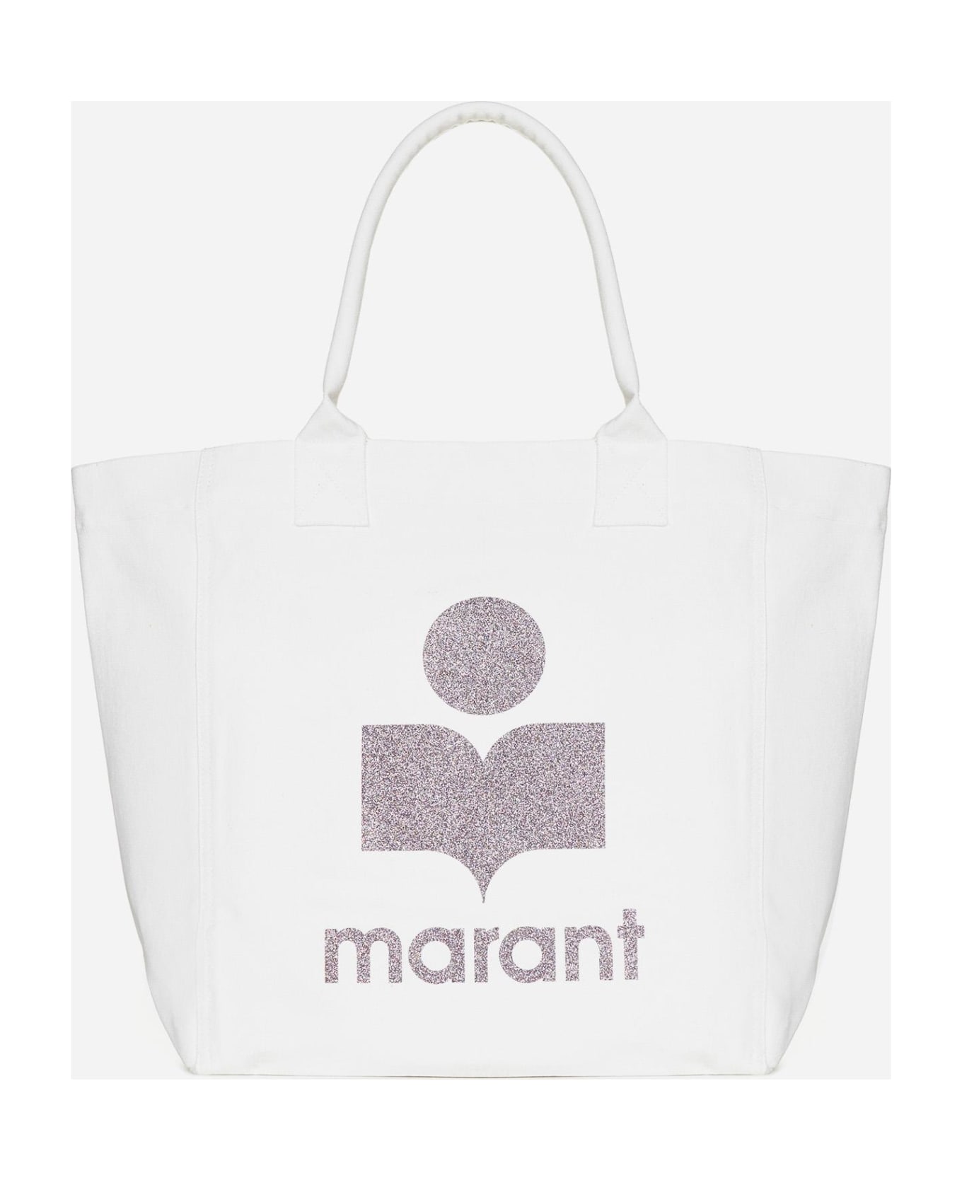 Isabel Marant's Yenky ecru cotton canvas tote bag featuring pink glitter logo printed at the front and two top handles. Composition: 100% cotton