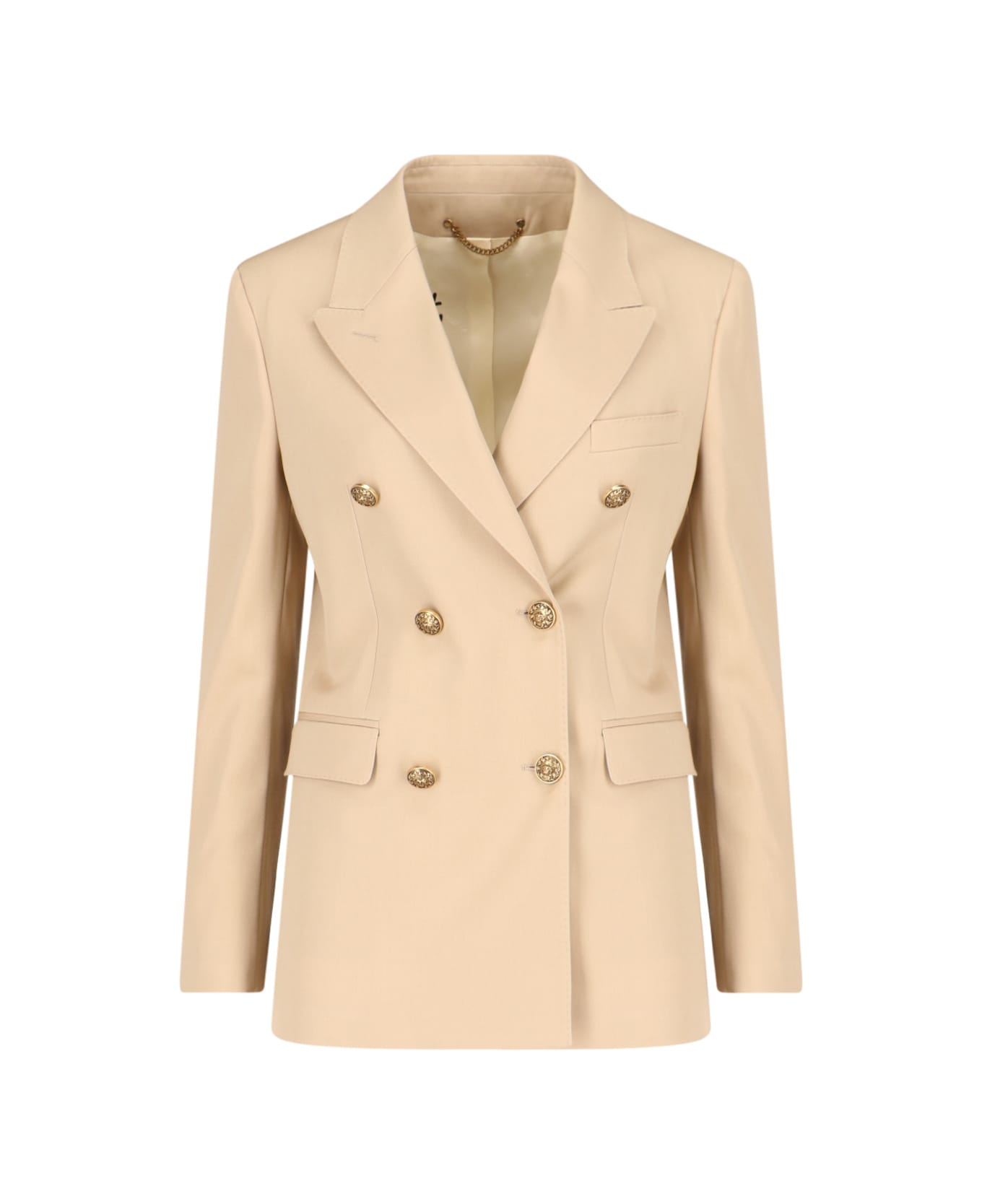 Golden Goose double-breasted, in beige virgin wool blazer with peak lapels, button closure, button cuffs, chest pocket, two front pleats, two side flap pockets, two gold metal stars at the back, straight hem. Composition: 100% Virgin Wool