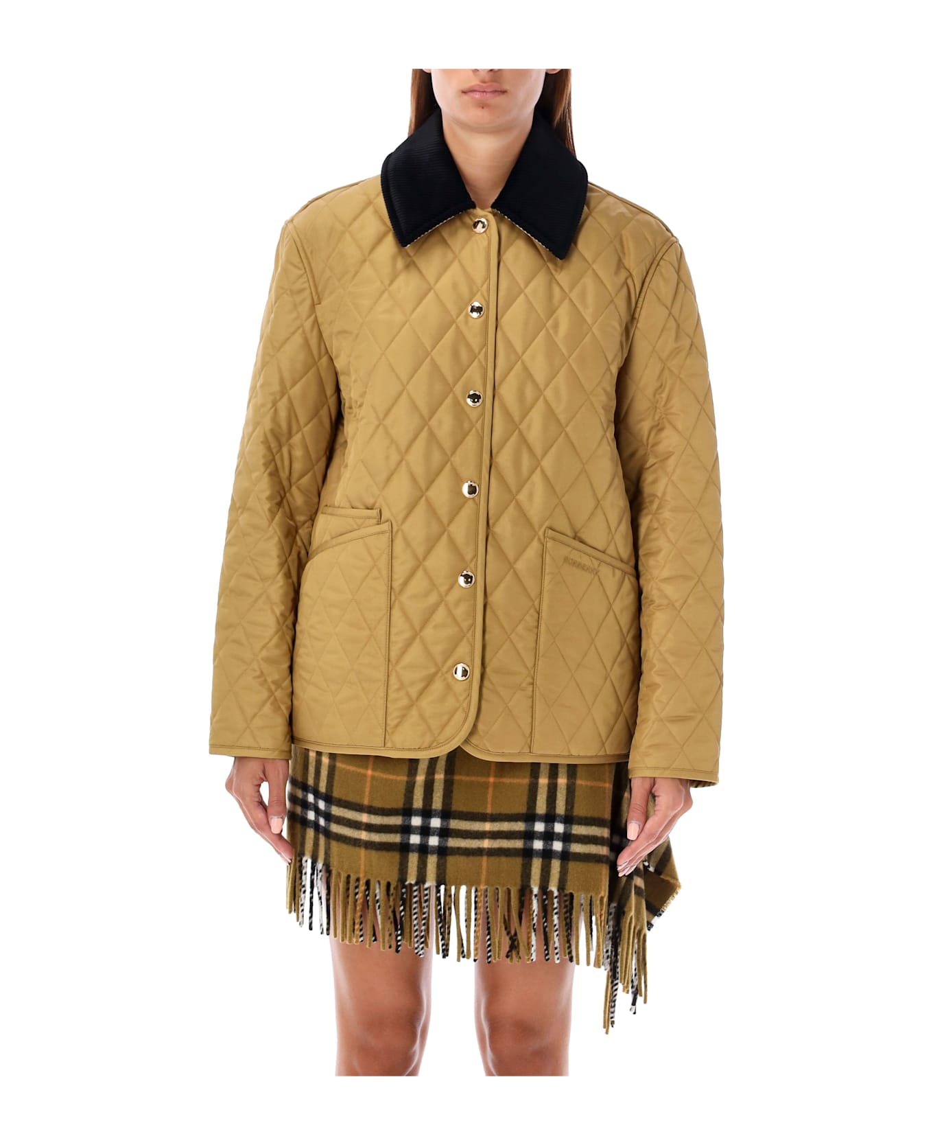 Quilted Barn Jacket By Burberry London. Featuring: Corduroy Collar Gold-tone Press-stud Closure With Logo Front Patch Pockets Embroidered Logo At Pocket Burberry Check Cotton Lining Regular Fit Model Is 1,72 M And Wears Size S