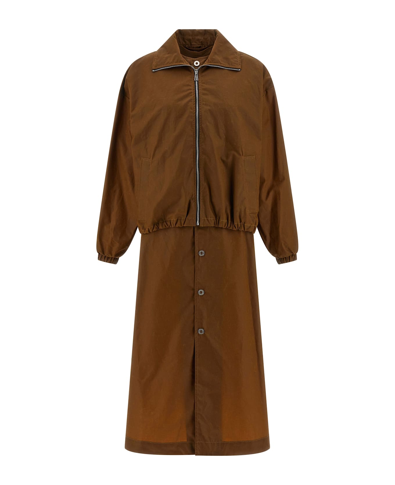 'Iryna' waxed cotton canvas trench coat consisting of bomber-style upper part with front zip closure, foldable high neck, long cuffed sleeves, pockets and elastic on the hem and extra long underside with front snap button closure, crew neck.