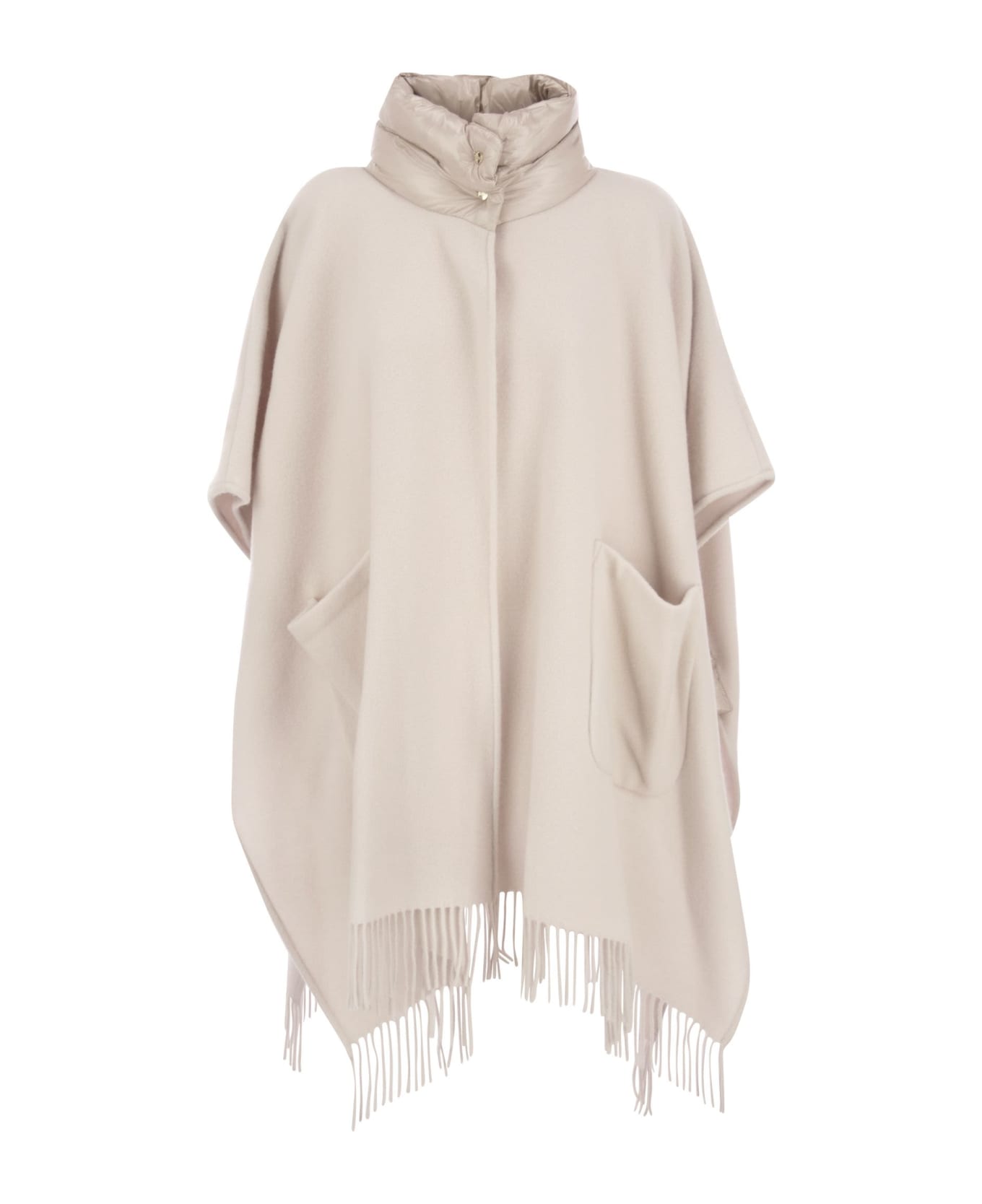 Poncho made of soft wool and cashmere blend fabric. The high neck is finished in Herno's iconic ultralight nylon: an innovative technical fabric that combines good water resistance with a particularly luxurious silk-like feel. - Over fit - High collar in ultralight nylon - Kimono sleeves - Zip closure - Patch pockets - Water-repellent treatment DESIGNER ID: GC00056DR 33395 1985 Composition: 90% Wool, 10% Cashmere Secondary fabric: 100% Polyamide Padding: 90% Goose down, 10% Goose feather
