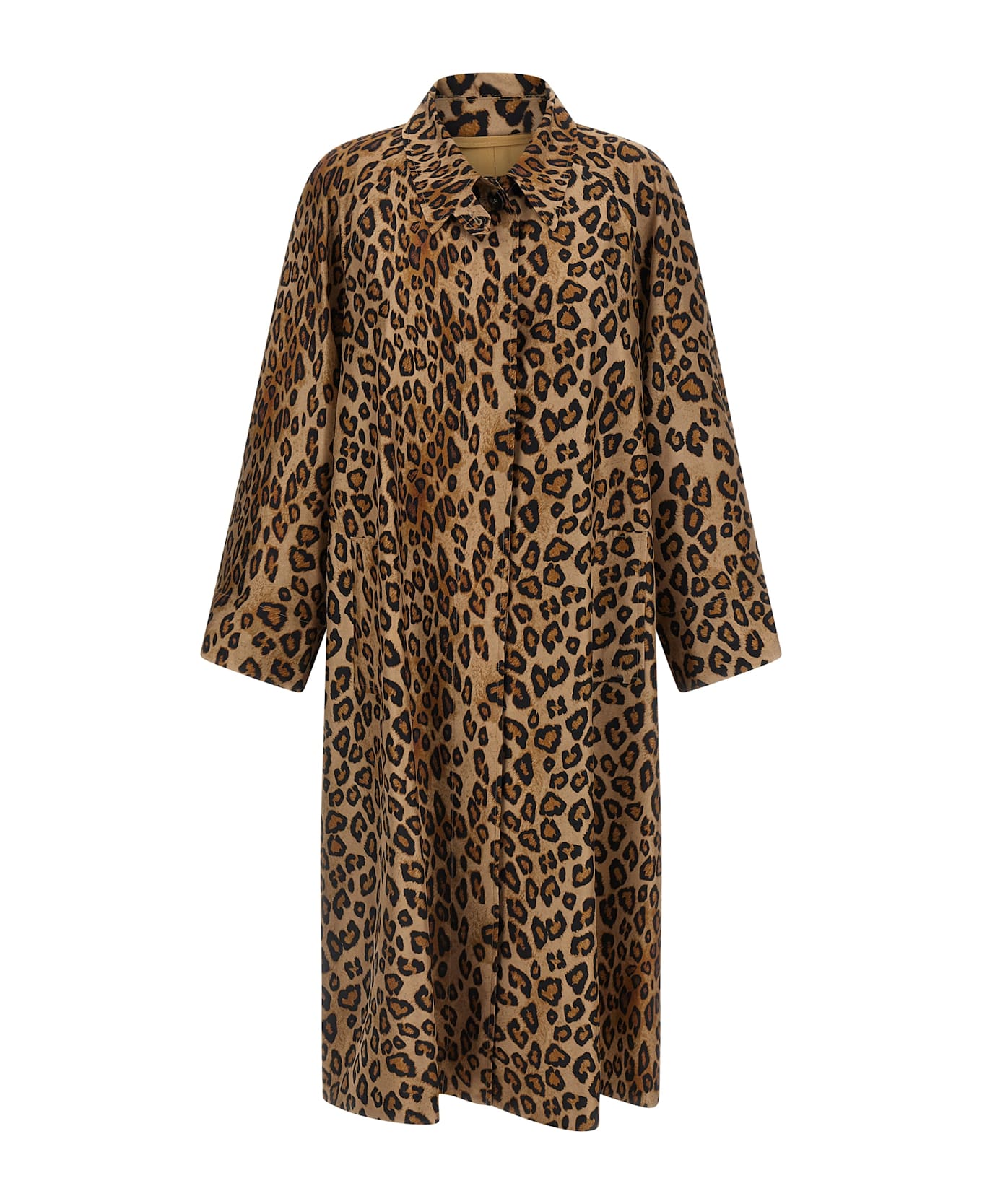 Animal print silk trench coat with shirt collar, front concealed button closure, pockets, long sleeves, back split, lining. Composition: 100% silk