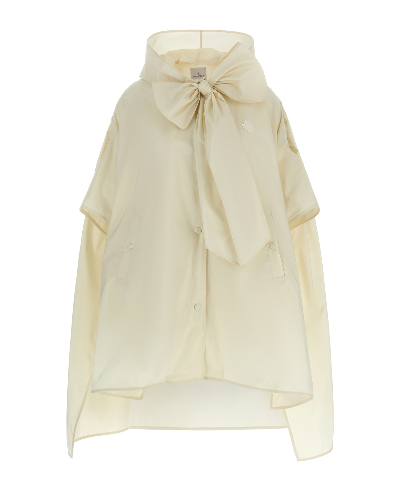 Light taffeta cape with airy draping, removable hood to create a front bow, high neck, tone-on-tone grosgrain logo patch and front snap button closure, and short sleeves.