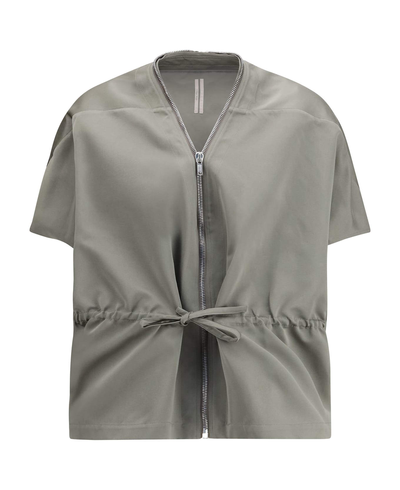 The satin jacket by rick owens is a sophisticated and contemporary piece, featuring a front zip closure that accentuates its minimalist and urban look. the drawstring waist allows you to adjust the fit, creating a more defined silhouette. the short sleeves complete the design, giving the jacket a fresh and modern touch. perfect for casual-chic looks, this satin jacket combines elegance and functionality in a single garment.