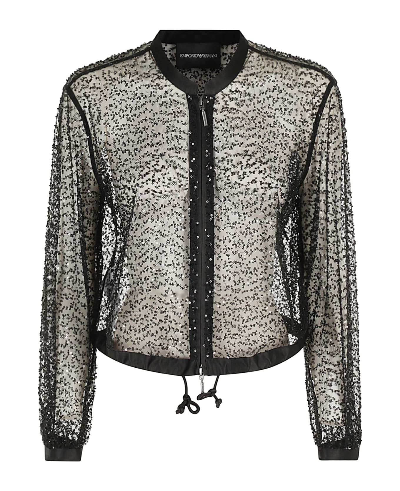 Cropped jacket - Emporio Armani - Black color - Mandarin collar - Zip closure - Sheer detail - Embroidered sequins - Satin inserts