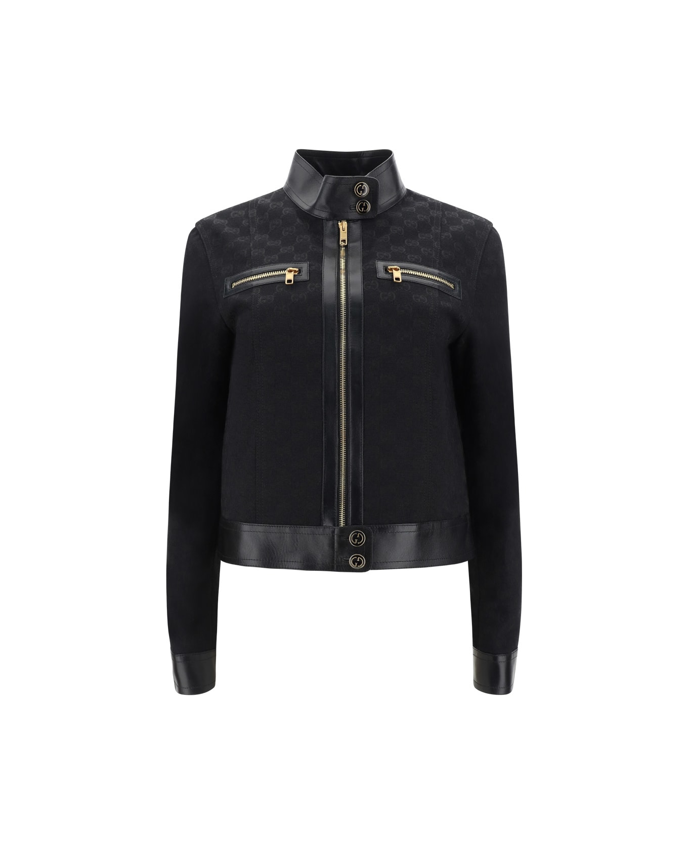 Jacket by gucci, front zipper closure, high collar with leather inserts and contrasting embossed snap button closure, two side slit pockets, one zippered welt pocket on front, iconic all-over tone-on-tone repeated gg monogram, contrasting inserts and trim.