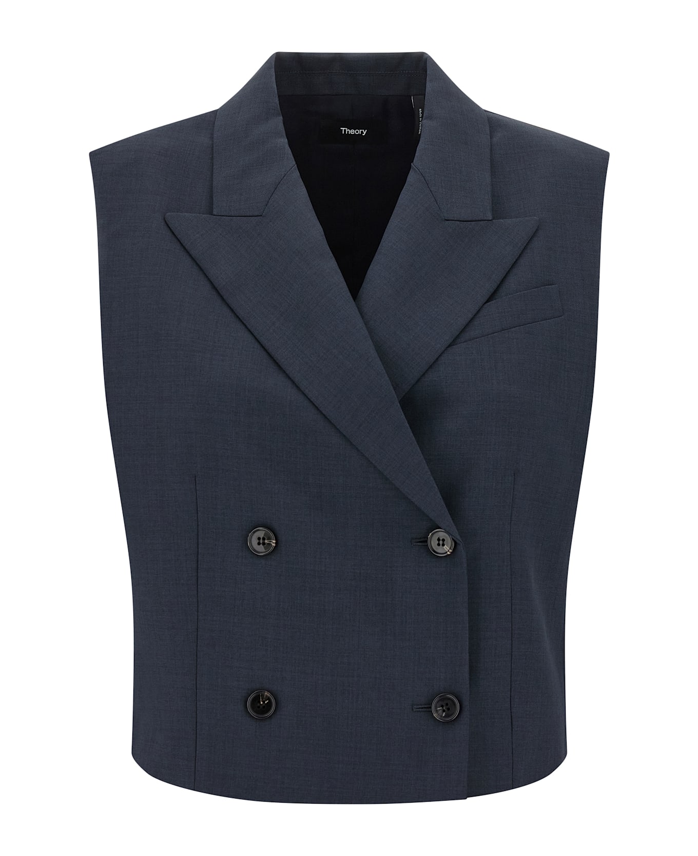 City Twill vest, slightly cropped double-breasted style with front button closure, peak lapels, chest pocket.