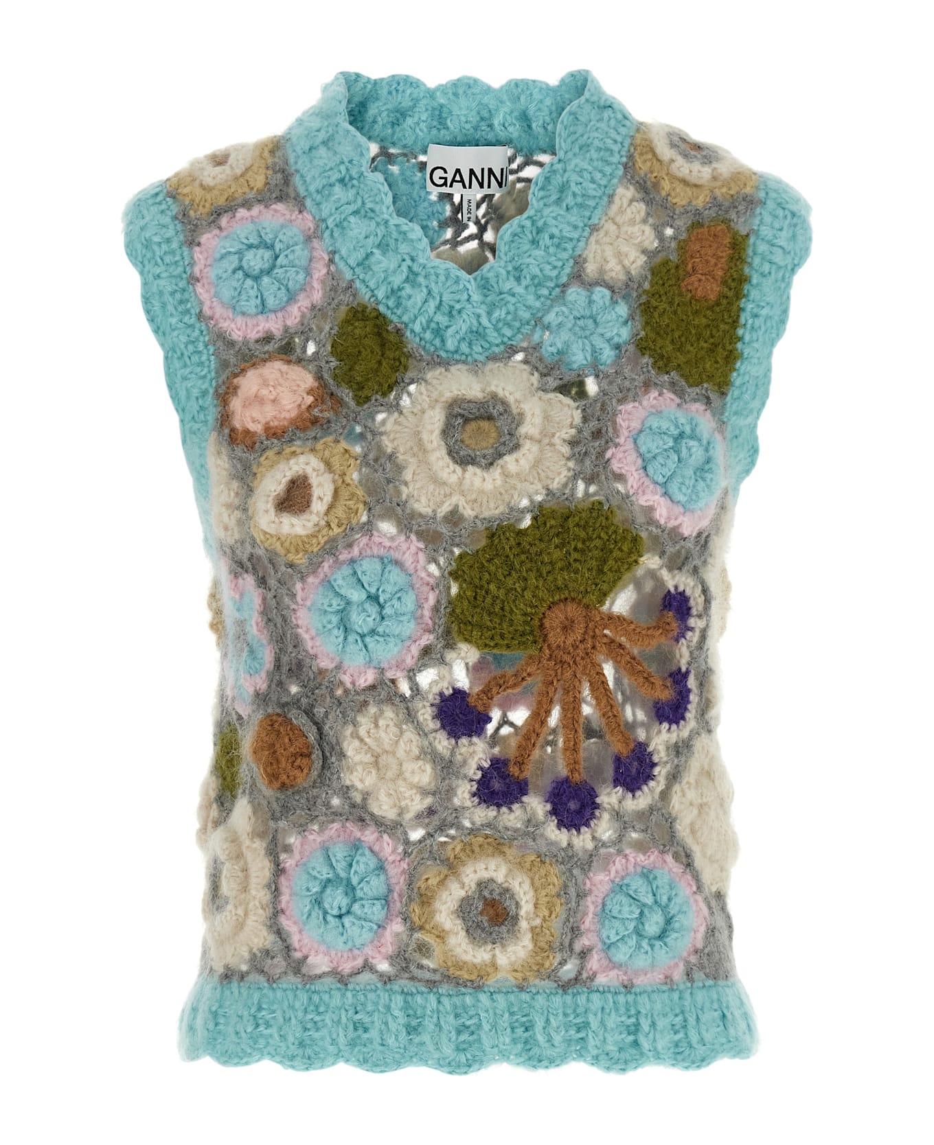 'Dreamy Floral' vest in mohair and crocheted wool blend with V-neck. Composition: 55% mohair wool 29% polyamide 16% wool