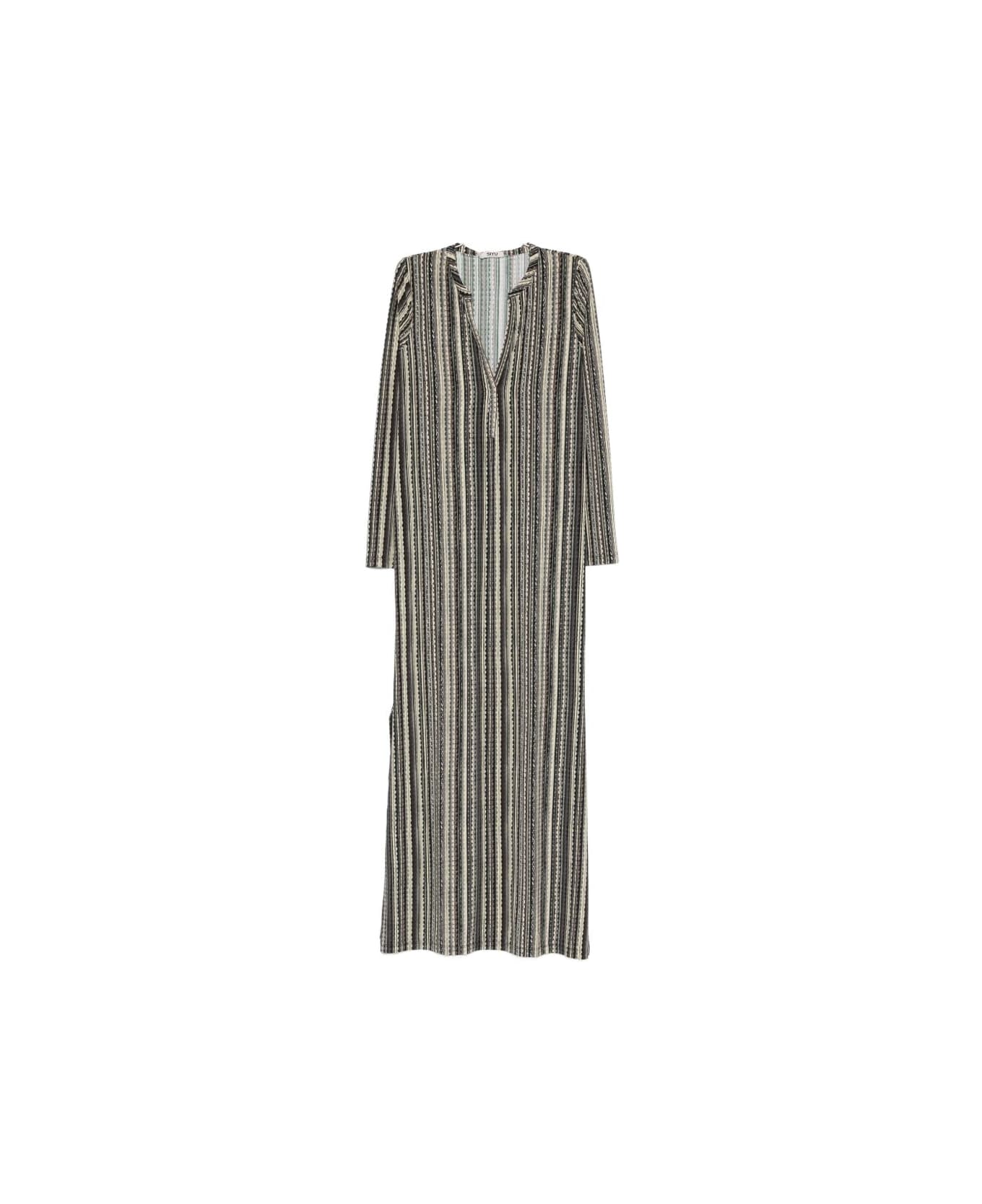 black/beige stripe pattern V-neck long sleeves side slits