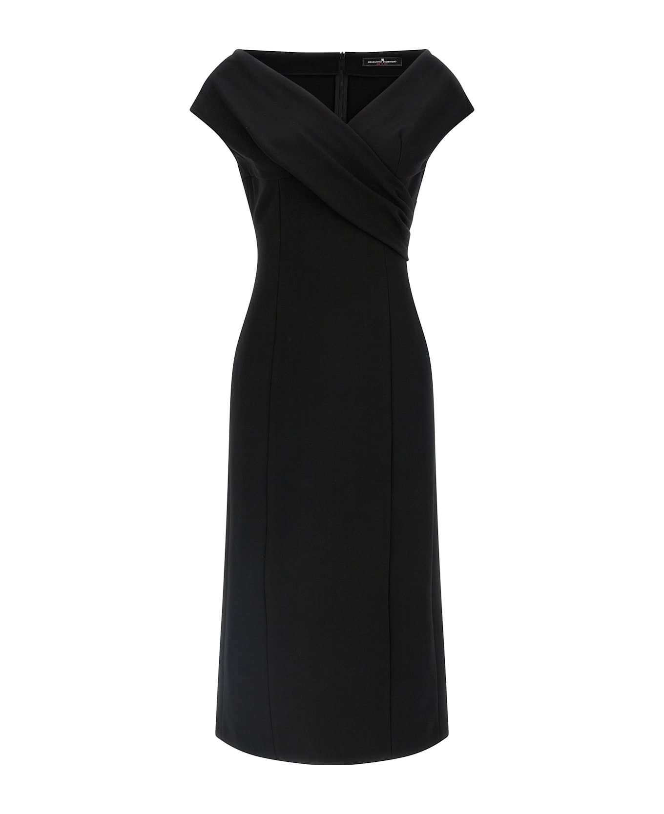 Midi dress in viscose blend, stretch, sheath dress, V-neck with crossover and front draping, sleeveless, zip closure and back split. Composition: 67% viscose 22% polyamide 11% elastane