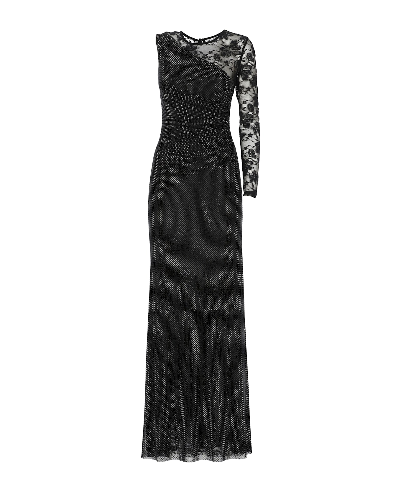 - Black Self Portrait dress for woman - Round neck - One long lace sleeve - Rear zip and button fastening - All-over strass pattern