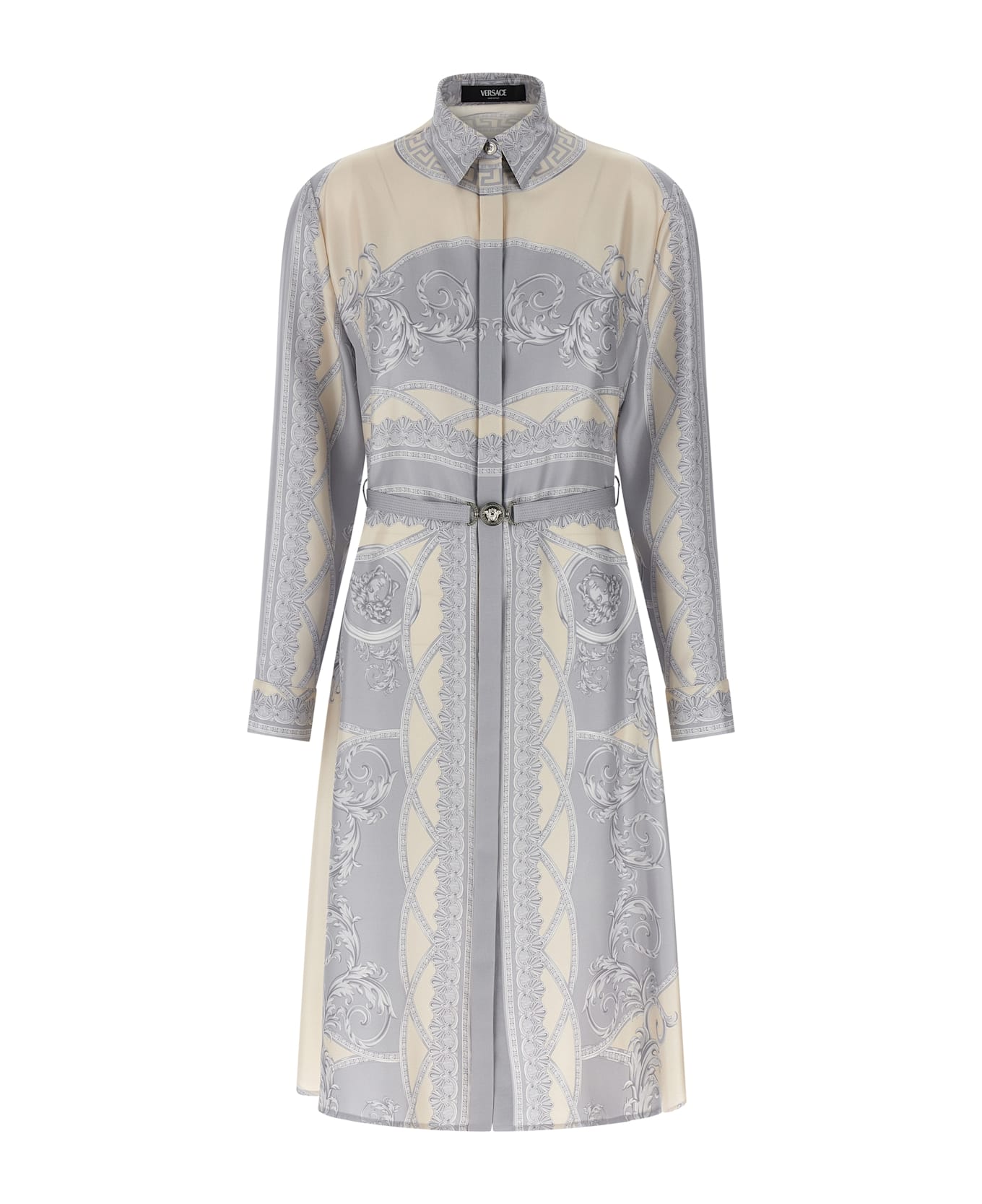 'La Coupe des Dieux' print silk twill dress, chemisier model, button closure, long sleeves with cuffs, pockets, elastic belt with removable metal buckle. Composition: 100% silk