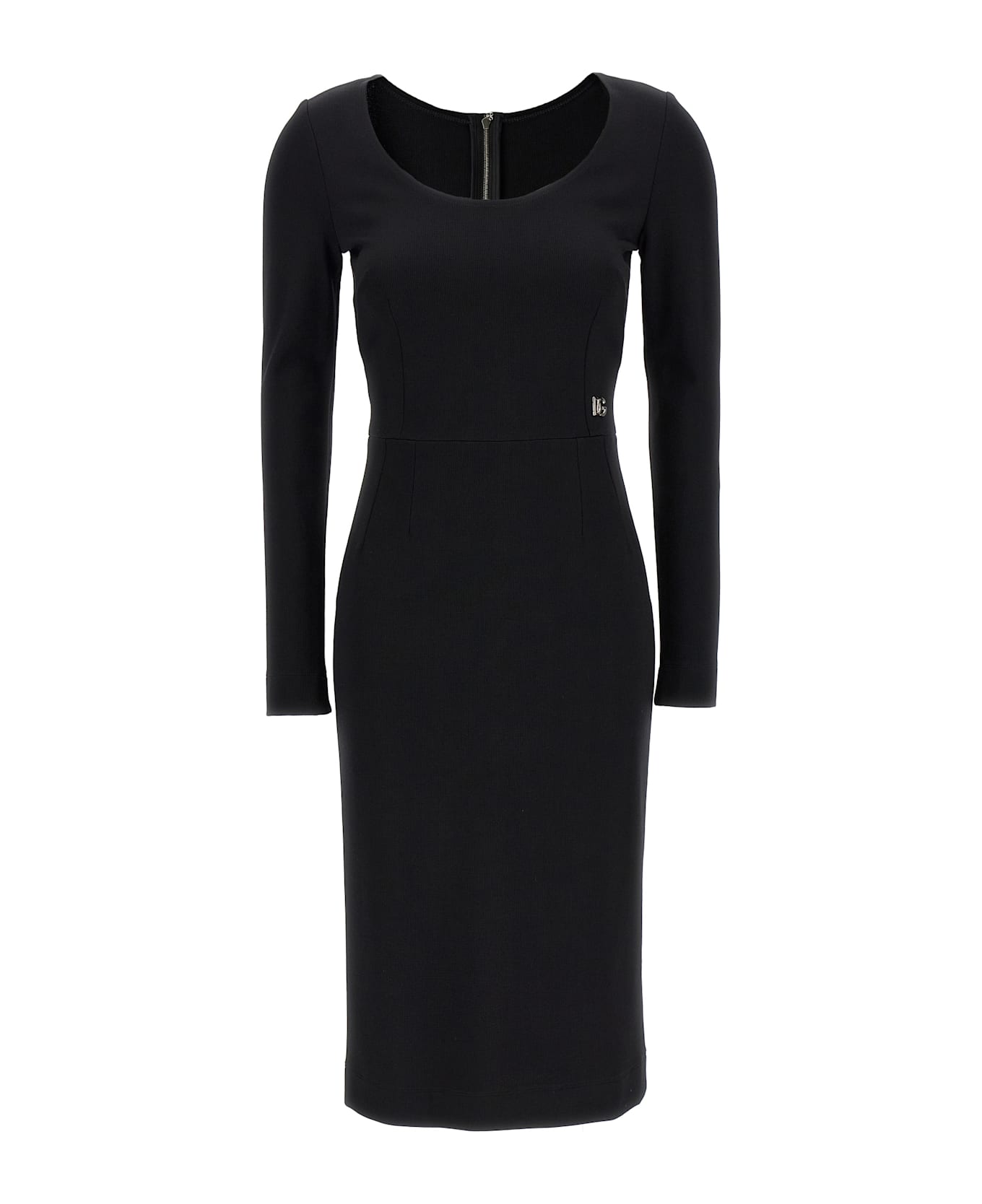 Stretch viscose midi dress with wide round neckline and metal logo detail. Composition: 73% viscose 23% polyamide 4% elastane