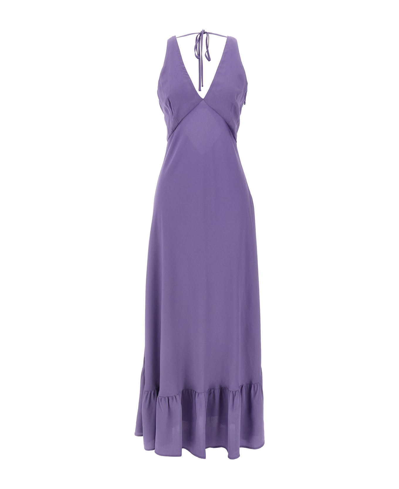 Long dress with deep V-neck at the front and back, back metal logo detail, lacing at the neck, flounce on the hem, and back zip closure. Composition: 100% viscose