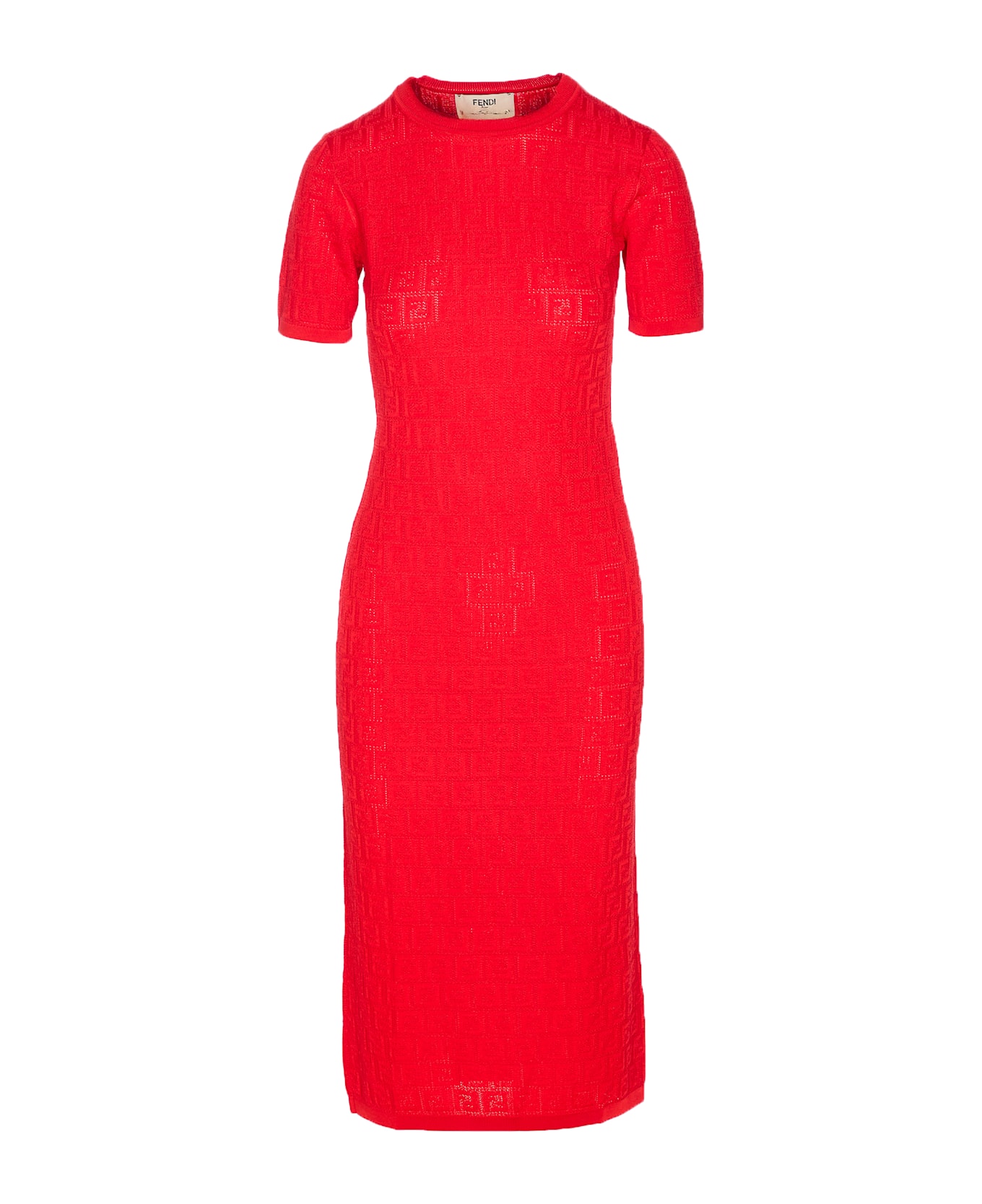 Fendi red dress, crewneck, FF lace logo, tight fit, long model, short sleeves Composition: 57% Cotton, 42% Viscose, 1% Polyamide