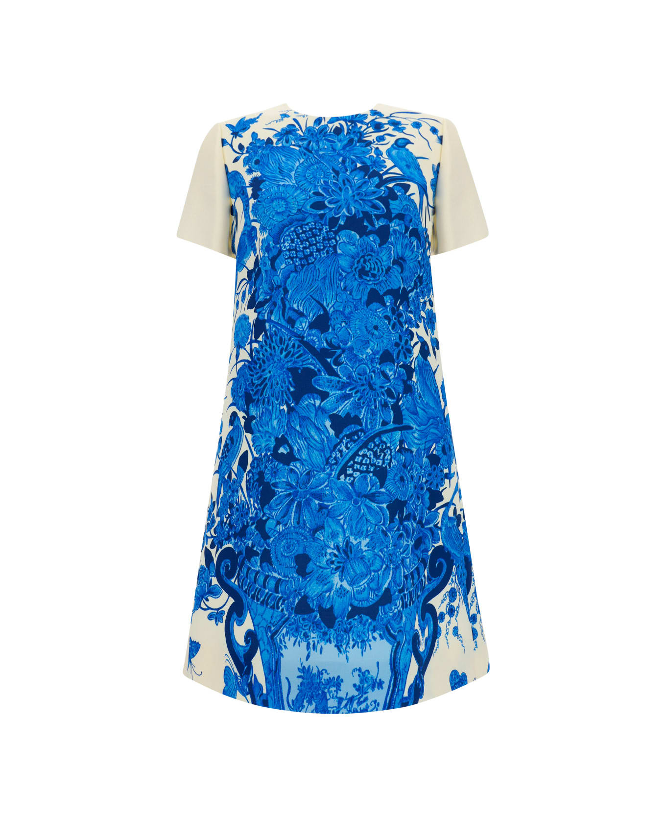 White Dress by Valentino Pap, blue print on front, short sleeves, zip closure on back, brand logo inside label. Composition: 65% Fleece Wool, 35% Silk