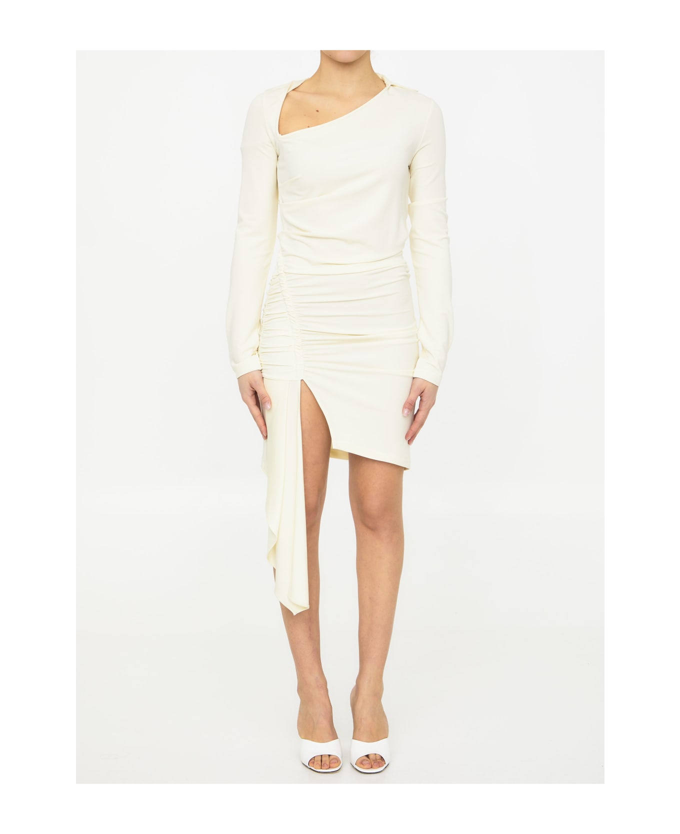 Draped dress in white viscose crêpe with stretch design. Asymmetric neckline and front slit with draping detail. Slim fit. The model is 180cm tall and wears size 40.