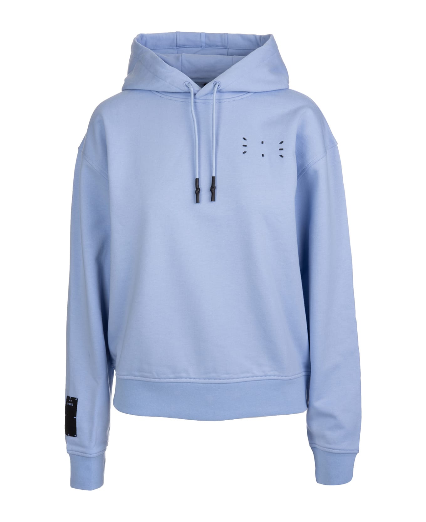Lilac soft fit hoodie by MCQ made of cotton and featuring hood with drawstring, long sleeves with low shoulder, ribbed elasticated hem and cuffs, contrasting logo applied on the chest, maxi tone-on-tone logo print on the back and logo patch on the bottom of right sleeve.