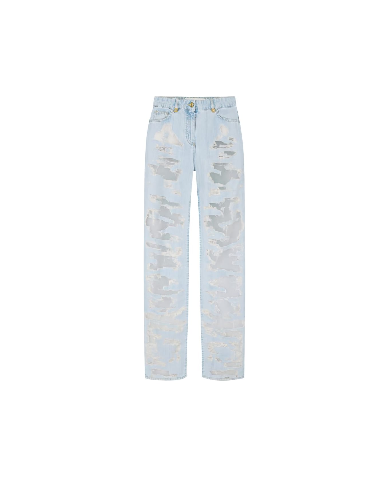 light blue distressed effect golden metal logo loops palazzo leg back pocket