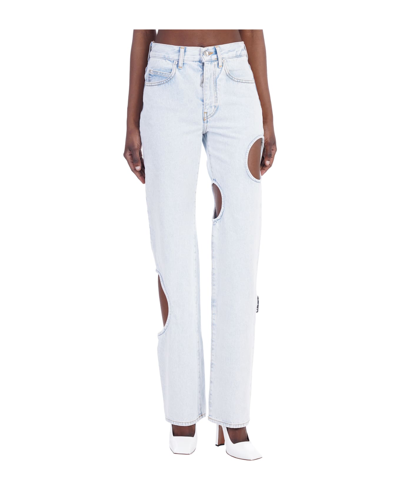Jeans in cyan cotton, waist belt loops, button and zip closure, cut out detail, five pockets, 100% cotton, Made in Italy, Model is 180 cm and wears size 26