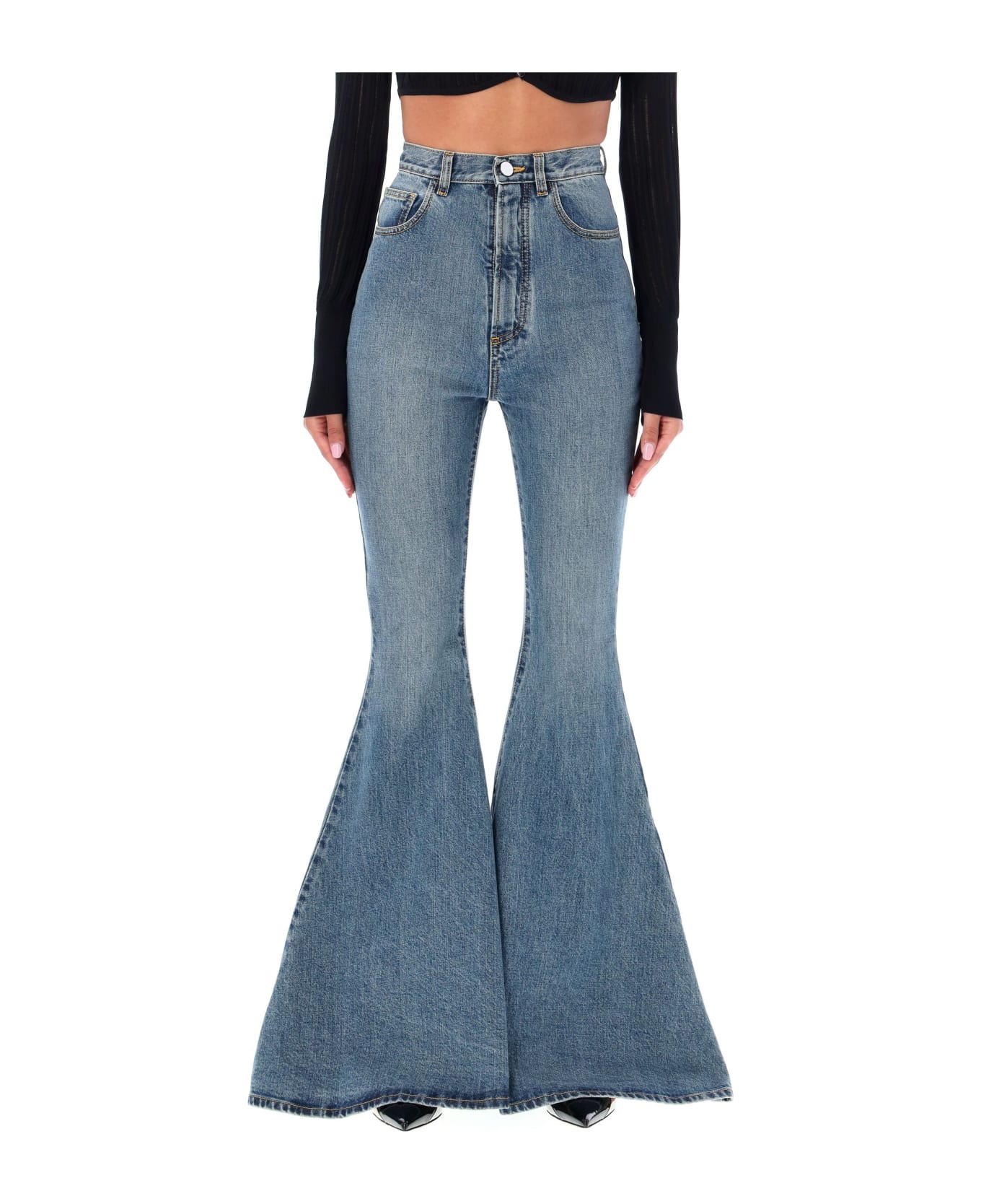 Maxi Flared Denim Jeans By Alaïa. Featuring: Flared Leg Jeans Stitches At The Back Denim Style Zip And Button Fastening Slant Side Pockets Back Patch Pockets Large Buffs Model Is 1,72 M Tall And She Is Wearing Size 36